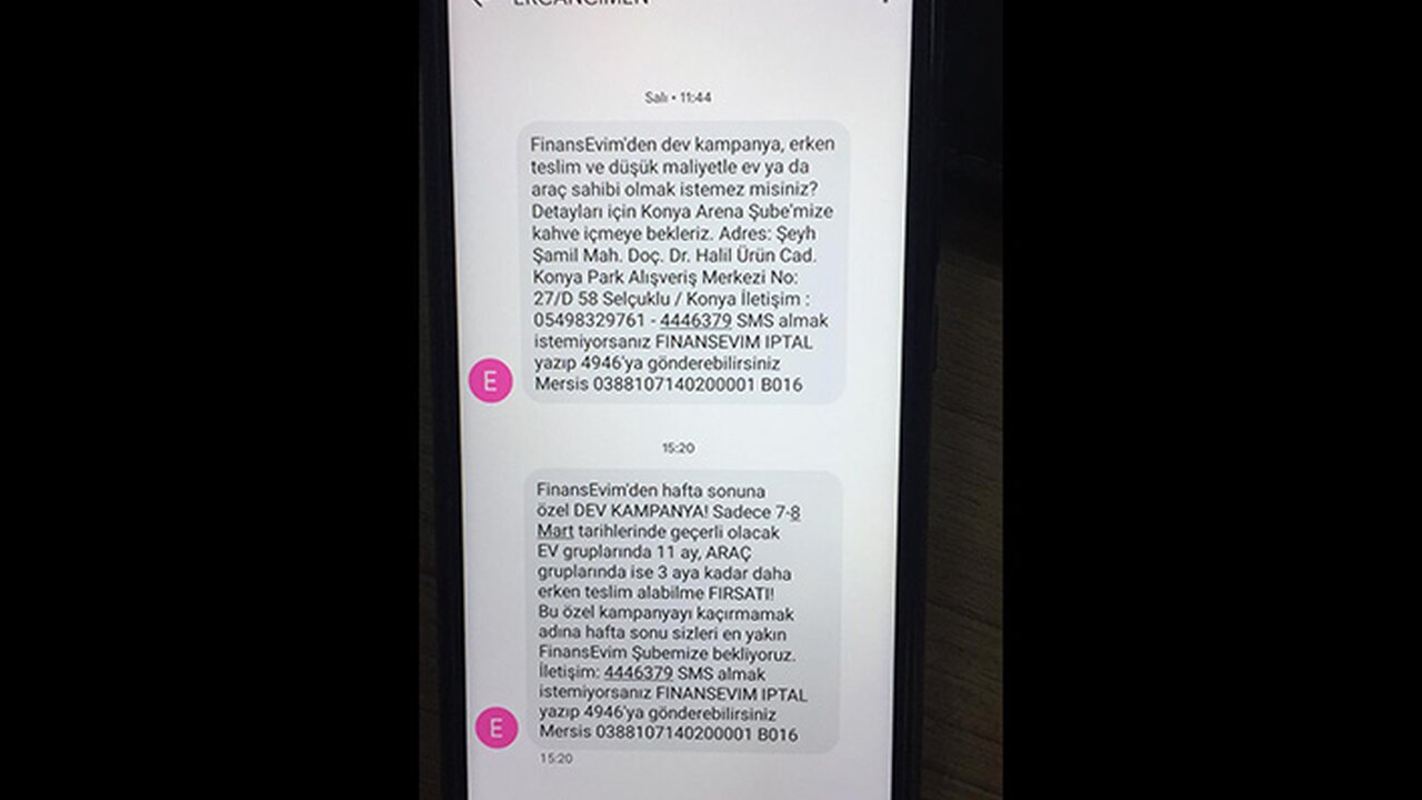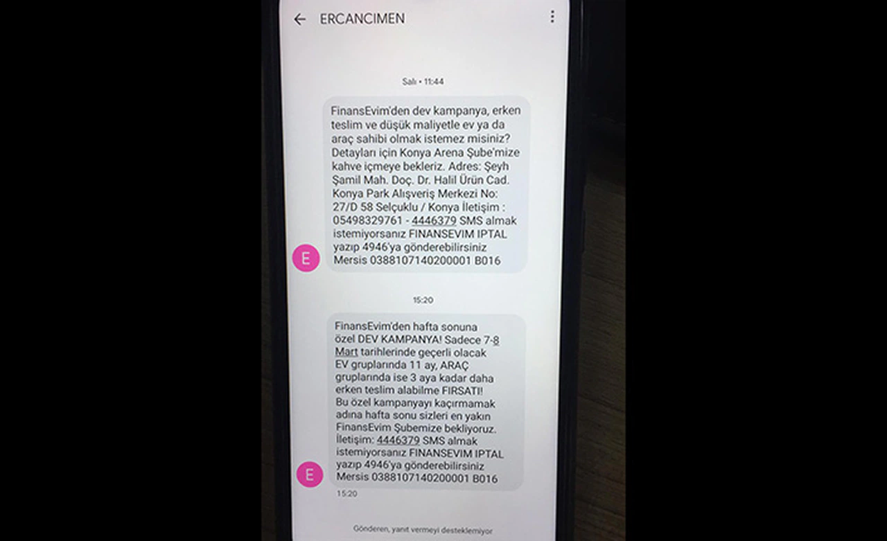 Hafta başından beri hem Gümüşhane merkezinde hem de il dışındaki Gümüşhaneli vatandaşlara giden kısa mesajlarda Konya merkezi "FinansEvim" firmasının ev ve araç kampanyası hakkında bilgi verildi.