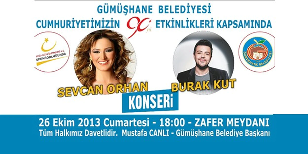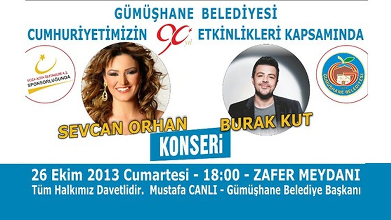 Gümüşhane Belediyesi Cumhuriyet Bayramı kutlama etkinlikleri çerçevesinde, 26 Ekim 2013 Cumartesi günü saat 18.00'da Zafer Meydanında, Burak Kut ve Sevcan Orhan'ın katılacağı bir konser düzenleyecek.