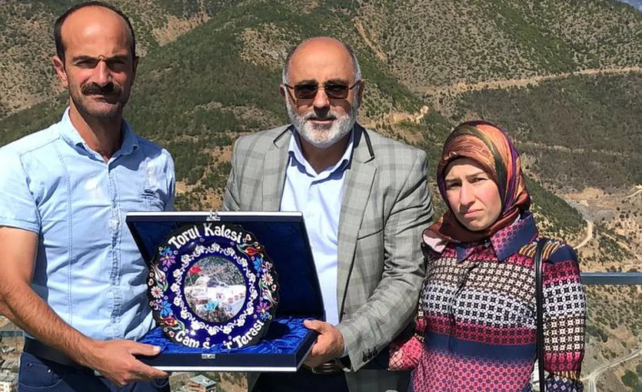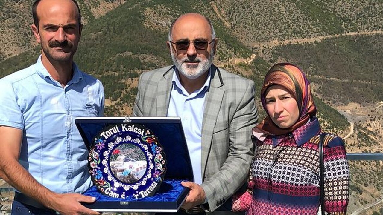 Torul Belediye Başkanı Mimar Nidai Köroğlu, 170 bin 173’üncü ziyaretçi olan Özer Yetim’i Cam Seyir Terası’nda tebrik ederek üzerinde Seyir Terası fotoğrafının yer aldığı hediyeyi takdim etti.