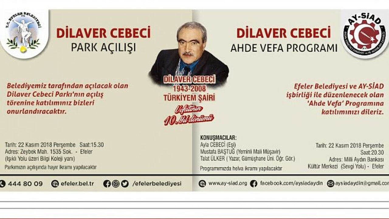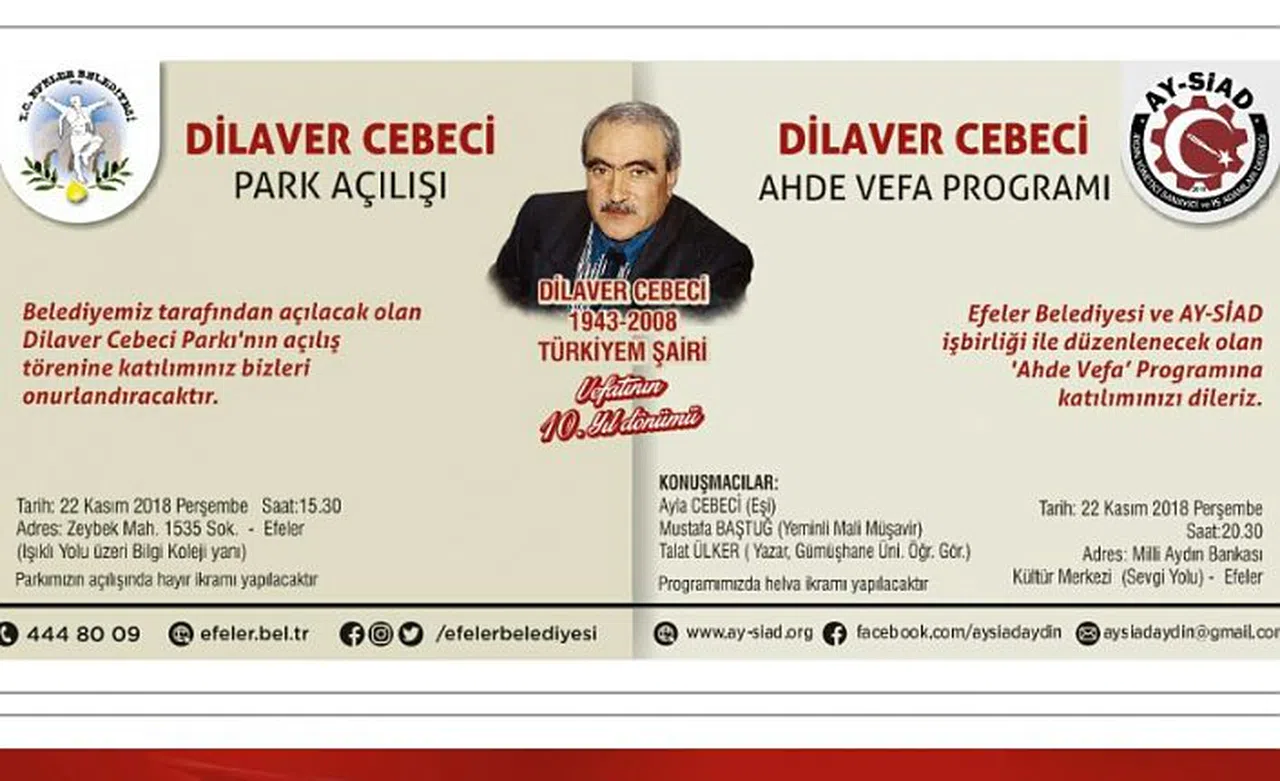 Aydın’ın Efeler ilçesi Belediyesi, tüm Türkiye’nin diline pelesenk olan ‘Türkiyem’ şiirinin yazarı Gümüşhaneli ünlü şair Dilaver Cebeci anısına park açılışı ve Ahde Vefa programı yapılacak.