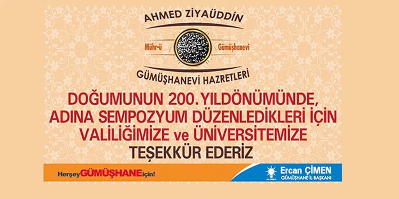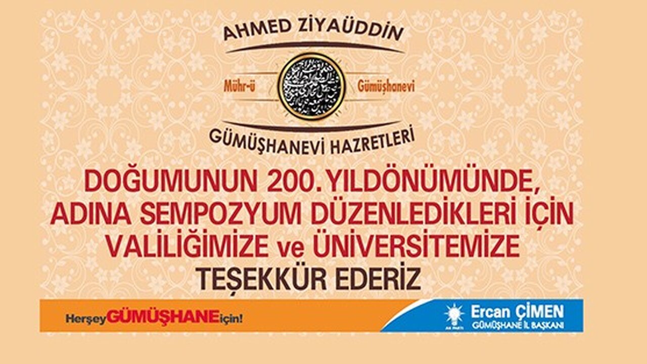 AK Parti Gümüşhane İl Başkanı Ercan Çimen, Gümüşhane’nin en önemli manevi dinamiklerinin başında gelen Ahmed Ziyaüddin-i Gümüşhanevi Hazretleri’nin doğumunun 200’üncü yıldönümünde Gümüşhane Valiliği ve Gümüşhane Üniversitesi’nin ortaklığı ile bu yıl ilki gerçekleştirilen ‘Uluslararası Ahmed Ziyaüddin-i Gümüşhanevi Sempozyumu’nun, şehrin yeni kimliğinin inşasında kilit öneme sahip bir konu olduğunu belirterek, maddi kalkınmanın olmazsa olmaz şartının manevi dinamikler olduğunu söyledi.