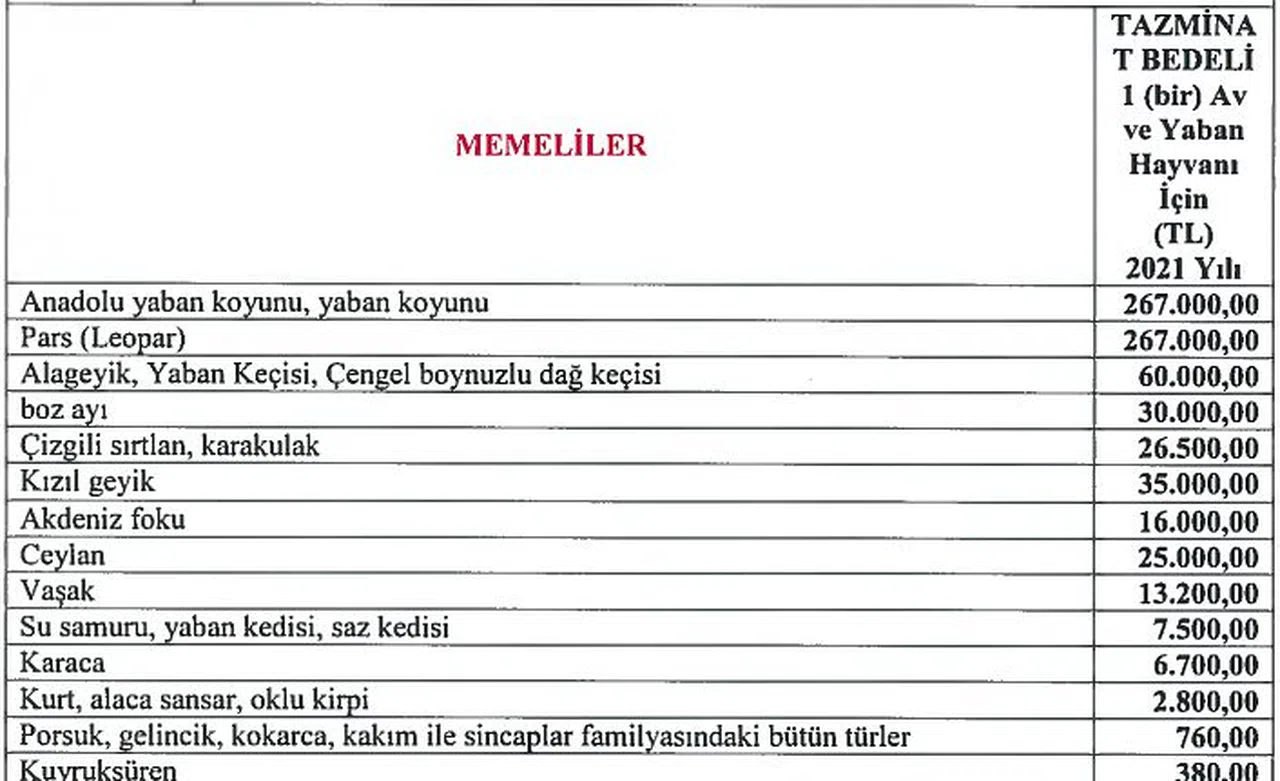 Tarım ve Orman Bakanlığı, Doğa Koruma ve Milli Parklar Genel Müdürlüğü 2021-2022 av döneminde av ve yaban hayvanları tazminat bedellerini belirledi.