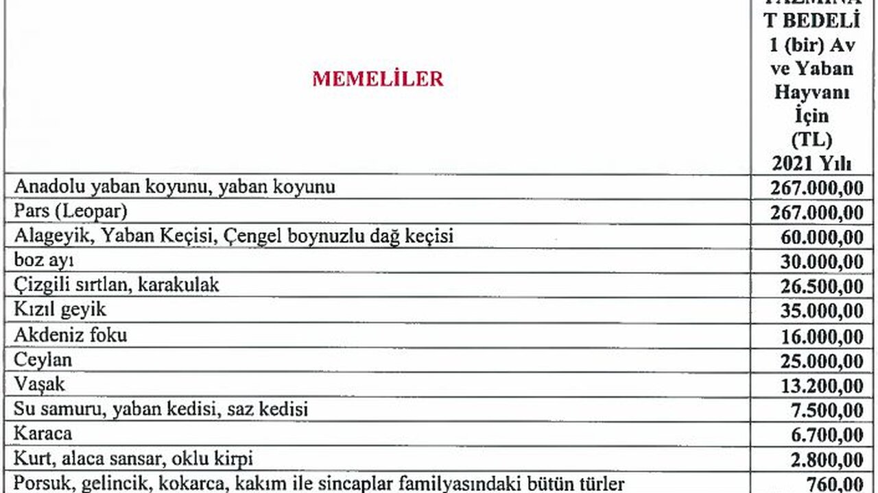 Tarım ve Orman Bakanı Bekir Pakdemirli imzasıyla yayımlanan tablodaki rakamlara idari yaptırım cezaları dahil edilmezken, geçtiğimiz yıl dağ keçisi, yaban keçisi ve boz ayı aynı kategorideyken bu yıl kategorileri güncellenerek ceza miktarları da artırıldı.