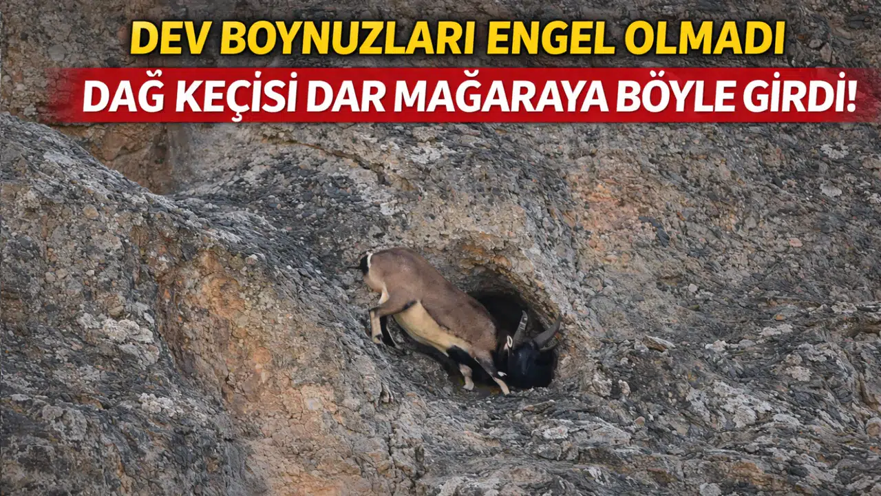 Edinilen bilgiye göre, yüksek rakımlı kayalık bölgede yiyecek arayışında olan yetişkin dağ keçisi, dar açıklığa sahip bir mağara girişine yöneldi. Oldukça büyük ve kıvrımlı boynuzlarına rağmen çevik hareketlerle dar geçitten içeri giren keçi, gözden kayboldu.