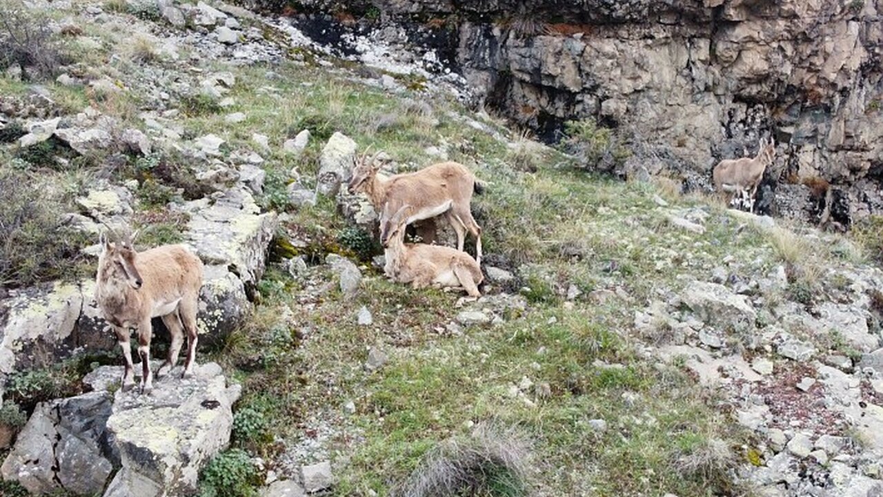 Coğrafyasının yüzde 60’ını oluşturan dağlarda son yıllarda sayıları hızla artan yaban keçilerine ev sahipliği yapan Gümüşhane’de sayıları 2 bine varan yaban keçileri doğal yaşam alanlarında görüntülendi. Doğa gezisi esnasında İsmail Özdemir isimli bir vatandaş tarafından fark edilen ve dronla kayıt altına alınan eşsiz anlarda 4 adet dağ keçisi dinlenirken görülüyor.