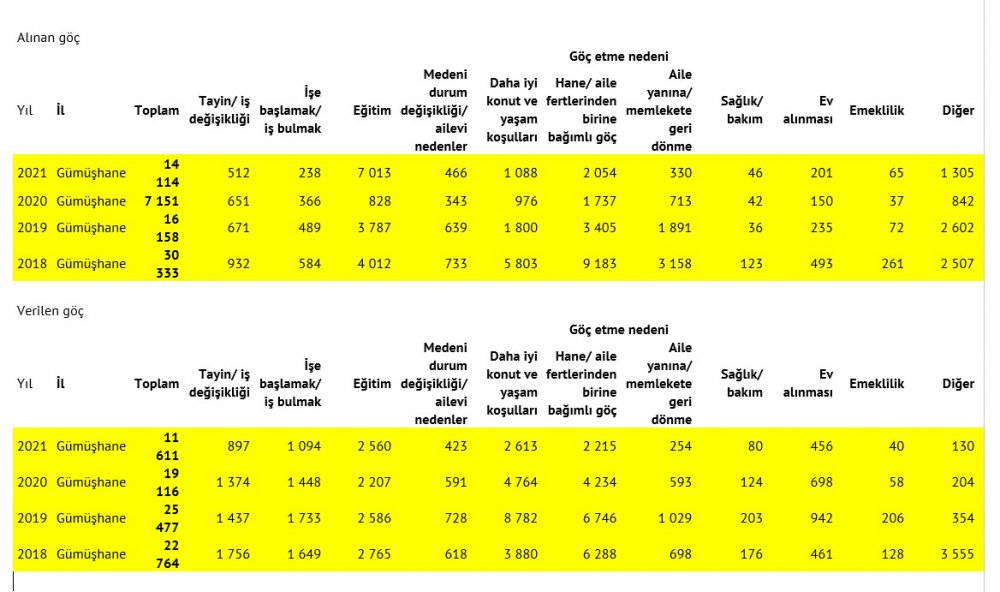 Tabloya göre Gümüşhane Türkiye genelindeki 81 il içerisinde tayin nedeniyle en az göç alan il, işe başlamak/iş bulmak için en az göç alan il, eğitim için en fazla göç alan üçüncü il oldu.