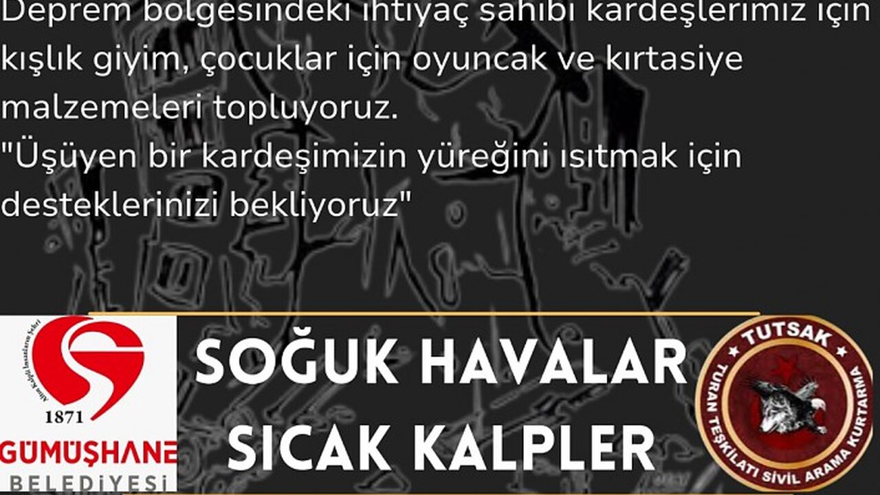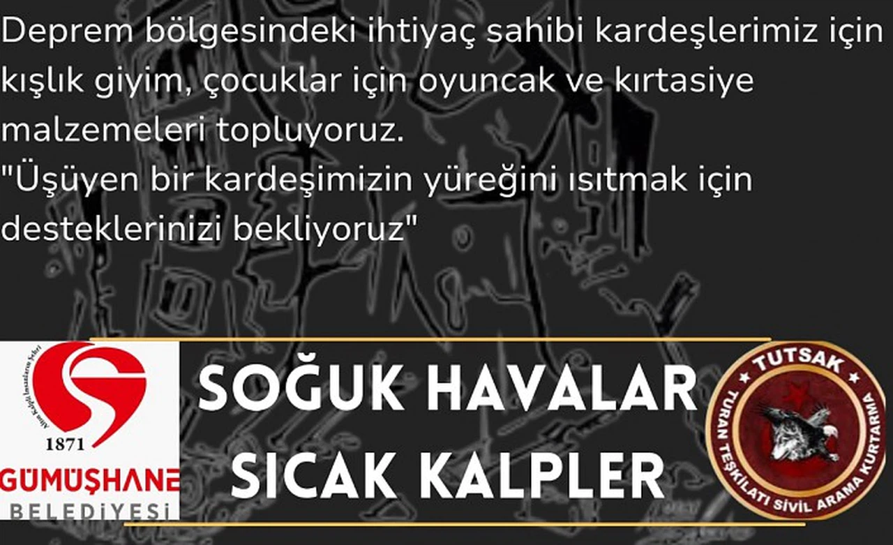 Deprem bölgesindeki ihtiyaç sahipleri için kışlık giyim, çocuklar için oyuncak ve kırtasiye malzemelerini “Üşüyen kardeşlerimizin yüreğini ısıtmak için desteklerinizi bekliyoruz” sloganıyla hayırsever vatandaşlardan talep ettiklerini kaydeden Turan Teşkilatı İl Başkanı Muhammet Aydın, “Ekip olarak gerek arama kurtarma çalışmalarında gerekse iyileştirme çalışmalarında elimizden geleni yaptık. Her zaman duyarlı olmaya çalıştık. Bugün de onları unutmadık, unutmayacağız da. Bu kapsamda Belediye Başkanımız Ercan Çimen’in de desteğiyle Gümüşhane Belediyesiyle ortaklaşa bu kampanyayı düzenledik. Başkanımıza da sıcak kalpler olarak altın kalpli insanlarımıza da teşekkür ediyorum. İnanıyorum ki bu kampanya çığ gibi büyüyecek. Gelen yardımlar Belediye’nin giriş katında toplanacak ve deprem bölgelerine ulaştırılacak” dedi.