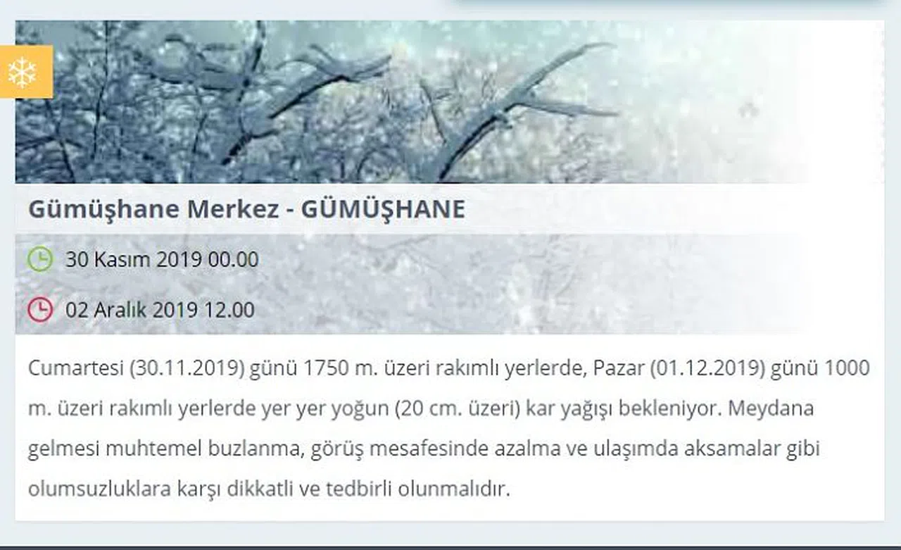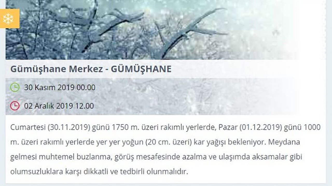 Meteoroloji Genel Müdürlüğü, Gümüşhane’yi hafta sonu etkili olması beklenen kar yağışı nedeniyle ‘Turuncu’ uyarı kategorisinden uyardı.