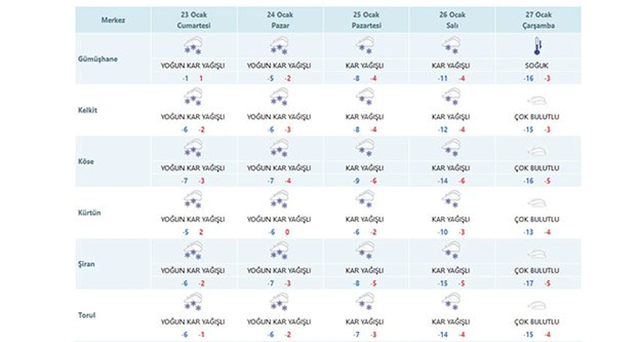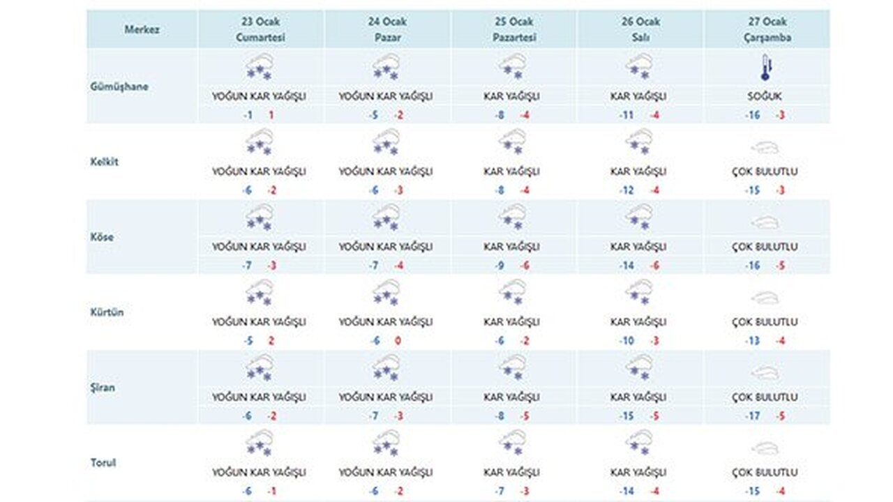 Kurumdan yapılan açıklamada 26 Ocak sabahına kadar etkili olması beklenen kar yağışının sabah saatlerinden itibaren Giresun çevrelerinde karla karışık yağmur ve kar, öğle saatlerinden sonra ve akşam Trabzon, Rize ve Artvin çevrelerinde karla karışık yağmur ve kar şekline döneceği, kar yağışlarının Salı gününe kadar etkili olacağı tahmin edildiği bildirildi.