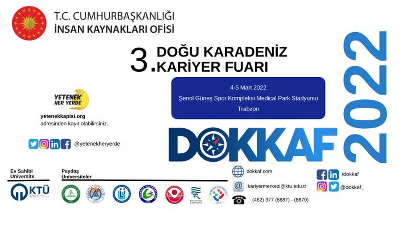 Bölgesel Kariyer Fuarları ile Türkiye’nin önde gelen işverenlerini, 40 gün boyunca 11 farklı şehirde gençlerle buluşturan kariyer fuarlarının bir sonraki durağı olan DOKKAF, Karadeniz Teknik Üniversitesi (KTÜ) ev sahipliğinde ve Gümüşhane Üniversitesi’nin de arasında bulunduğu 7 üniversitenin desteği ile düzenlenecek.
