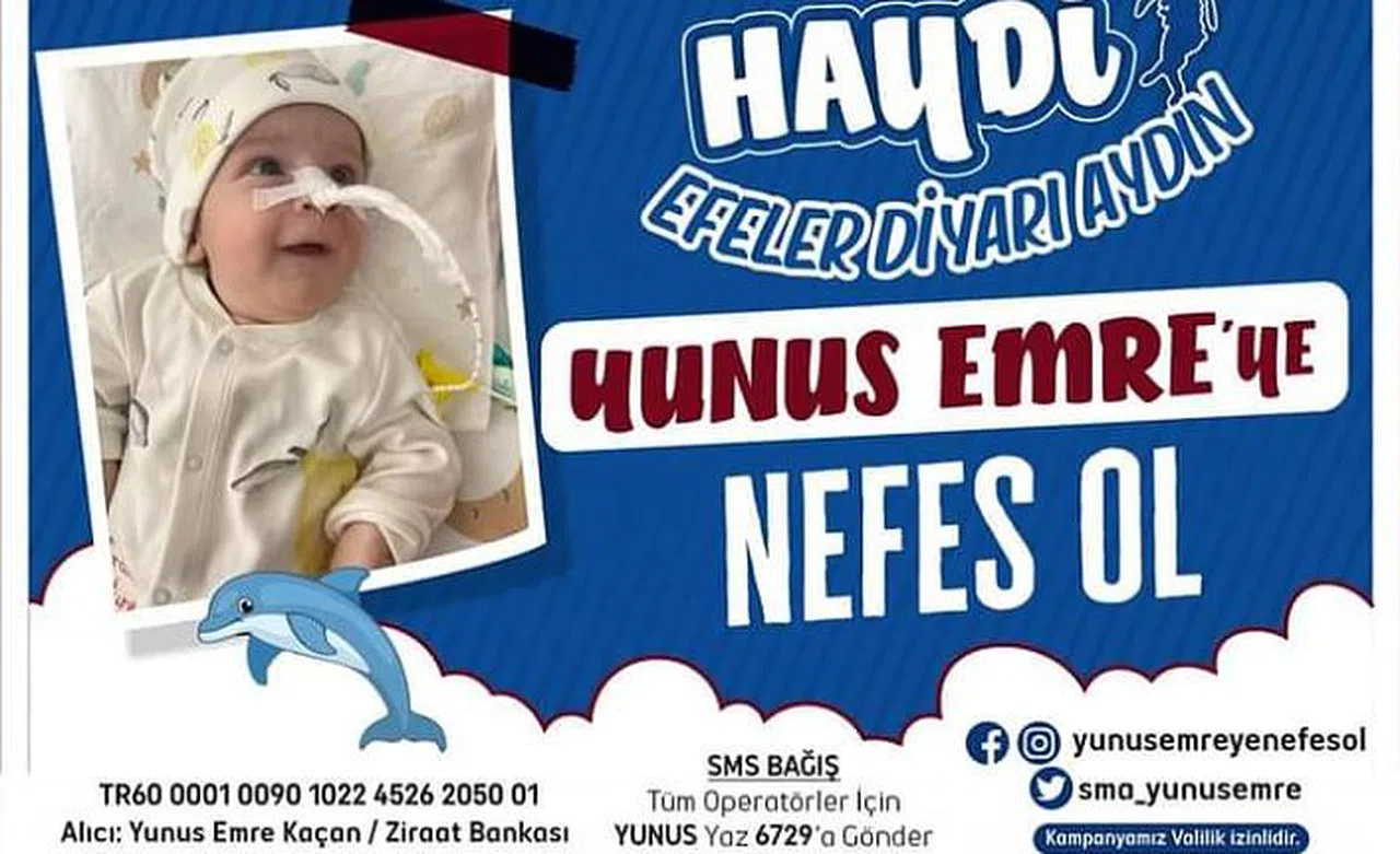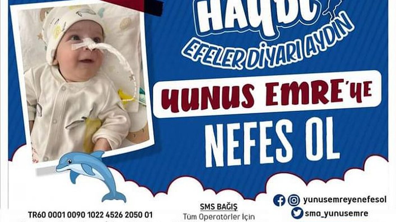 Bakımı çok zahmetli ve tedavisi çok pahalı olan hastalıkla mücadele eden Yunus Emre bebek, daha 2 aylıkken elleri içeri çekildi ve göğüs kafesi çöktü. Hastalığın pençesinde makinelere bağlı yaşamını sürdüren Yunus Emre bebeğin tedavisi ve diğer masrafları için bugünkü kurla gerekli olan 31,5 milyon TL’nin toplanması için gerek kurumsal gerek bireysel olarak farkındalık etkinlikleri devam ediyor.