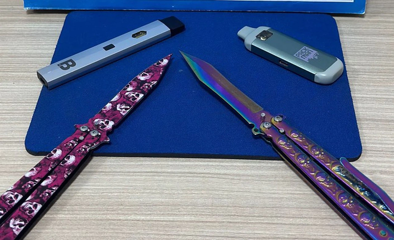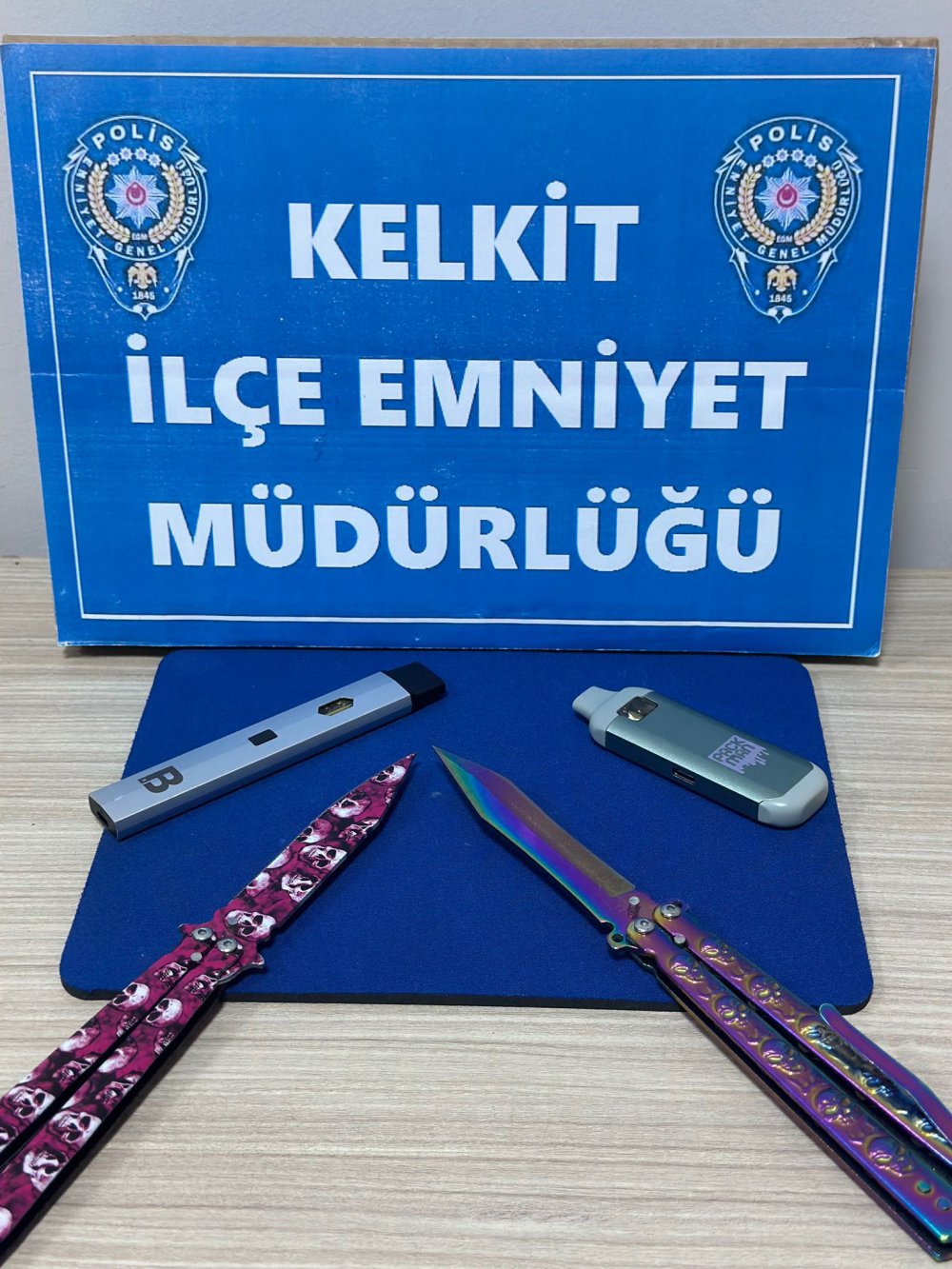 Kelkit İlçe Emniyet Müdürlüğü ekipleri ilçe merkezinde gerçekleştirdiği şok operasyonda şüpheli 2 şahsın üzerinde yaptığı aramada içerisinde likit esrar olduğu değerlendirilen 2 elektronik sigara aparatı ile 2 adet kelebek diye tabir edilen bıçak ele geçirdi.