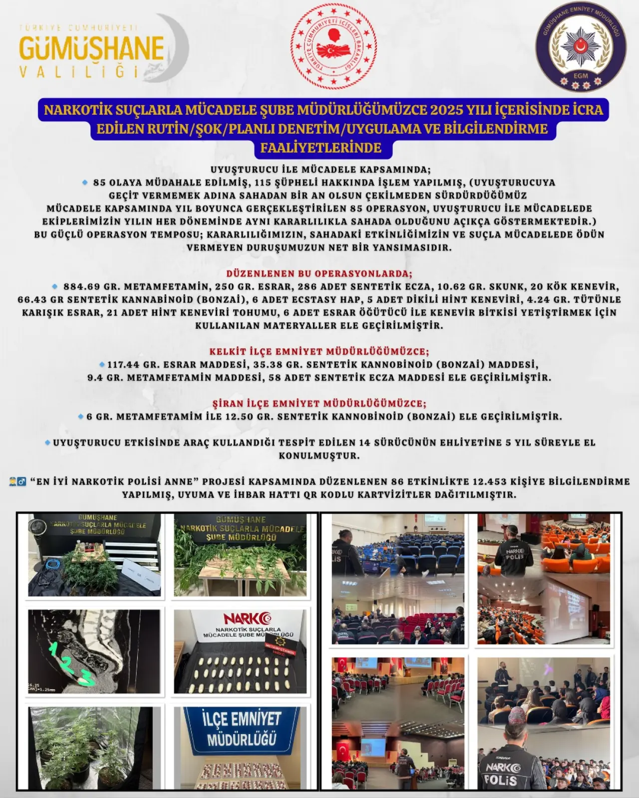 Gümüşhane İl Emniyet Müdürlüğü Narkotik Suçlarla Mücadele Şube Müdürlüğü, 2025 yılı içerisinde uyuşturucu ile mücadele kapsamında yürüttüğü kararlı operasyonların ve bilgilendirme faaliyetlerinin bilançosunu kamuoyuyla paylaştı.