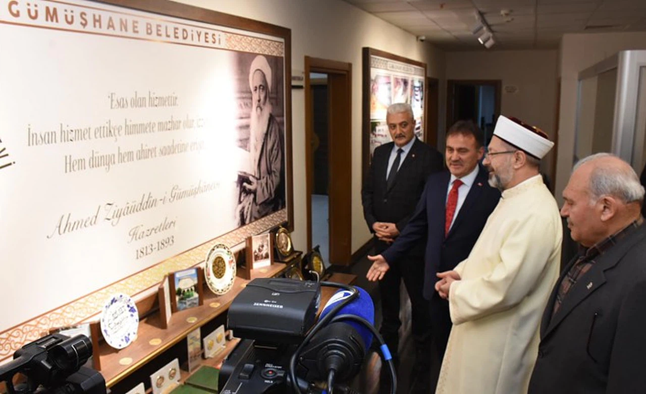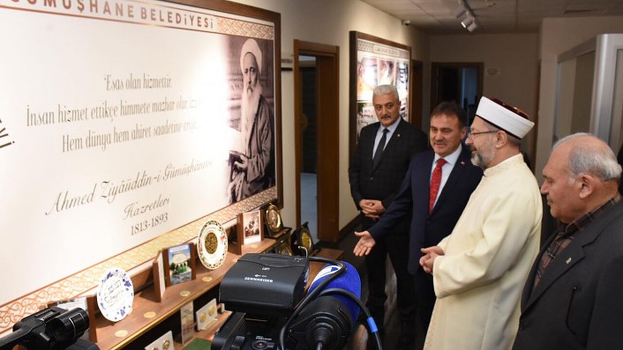 Gümüşhane gezisinde, büyük İslam Âlimi Ahmed Ziyaüddin Gümüşhanevî Hazretleri’ni ve Diyanet İşleri Eski Başkanı Gümüşhaneli Lütfi Doğan Hocayı da sık sık konuşmalarında dile getiren Başkan Erbaş, Gümüşhane Belediyesi ziyaretinde de Ahmed Ziyaüddin Gümüşhanevî Hazretleri’nin “Esas olan hizmettir. İnsan hizmet ettikçe himmete mazhar olur, izzet bulur. Hem dünya hem ahiret saadetine erişir” sözlerinin yazılı olduğu tabloyu uzun süre okuyup inceledi.