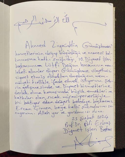 Gümüşhane Belediyesi ziyareti sonrası şeref defterini imzalayan Diyanet İşleri Başkanı Prof.Dr. Ali Erbaş, Başkan Çimen’e hem teşekkür hem de dua etti. Başkan Erbaş şeref defterine şunları yazdı: “Ahmed Ziyaüddin Gümüşhanevî Hazretleri’nin doğup büyüdüğü ve manevi kalkınmasına katkı sağladığı, 10. Diyanet İşleri Başkanımız Lütfi Doğan hocamızın memleketi, âlimler diyarı Gümüşhane vilayetimizi ziyaret etmiş olmaktan duyduğum memnuniyeti özellikle ifade etmek istiyorum. Şehrin gelişmesinde ve Diyanet hizmetlerine destek olma konusunda büyük emekleri ve katkıları olan, sıcak misafirperverliğiyle bizi bahtiyar eden değerli Belediye Başkanımız Ercan Çimen Bey’e kalbi şükranlarımı sunuyorum. Allah yar ve yardımcısı olsun. 23 Şubat 2024 Prof.Dr. Ali Erbaş Diyanet İşleri Başkanı.”