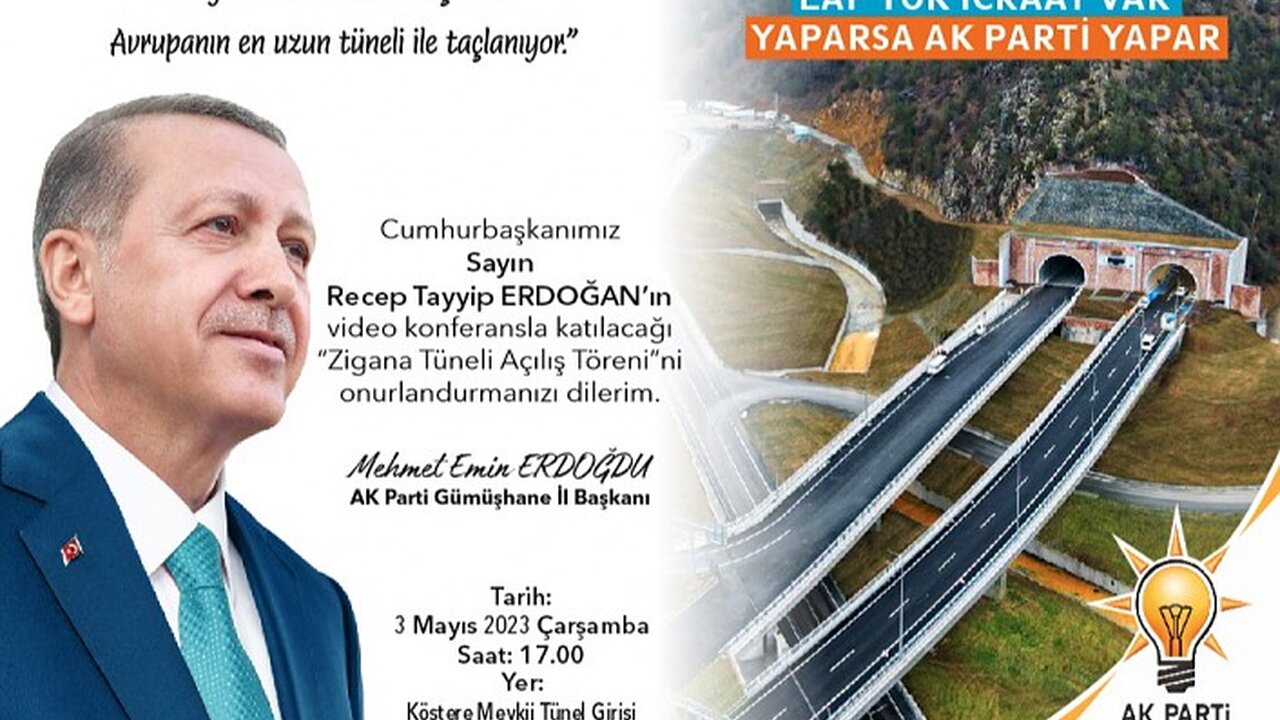 AK Parti Gümüşhane İl Başkanı Mehmet Emin Erdoğdu, konuya ilişkin yaptığı açıklamada, Avrupa’nın en uzun tünelini hizmete açacak olmalarının heyecanı içinde olduklarını söyledi.