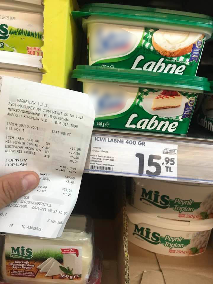 Vatandaşın paylaştığı etikette dikkat çeken bir diğer unsur ise rafta duran 400 gram ambalajlı labne peynirin fiyatının en son 10 Eylül 2021 tarihinde değiştiği ve bir ay geçmeden yüzde 13 oranında zamlanması oldu.