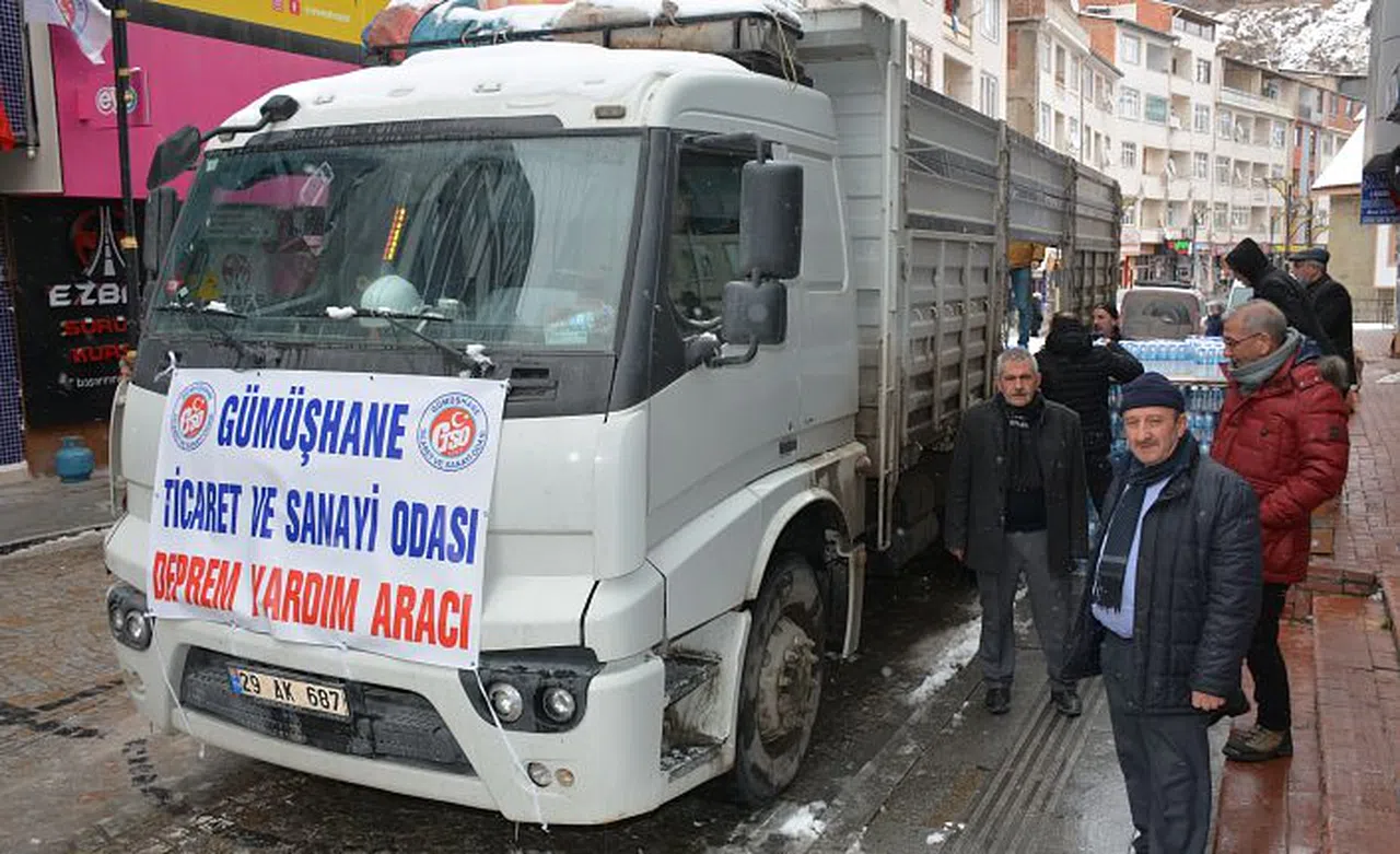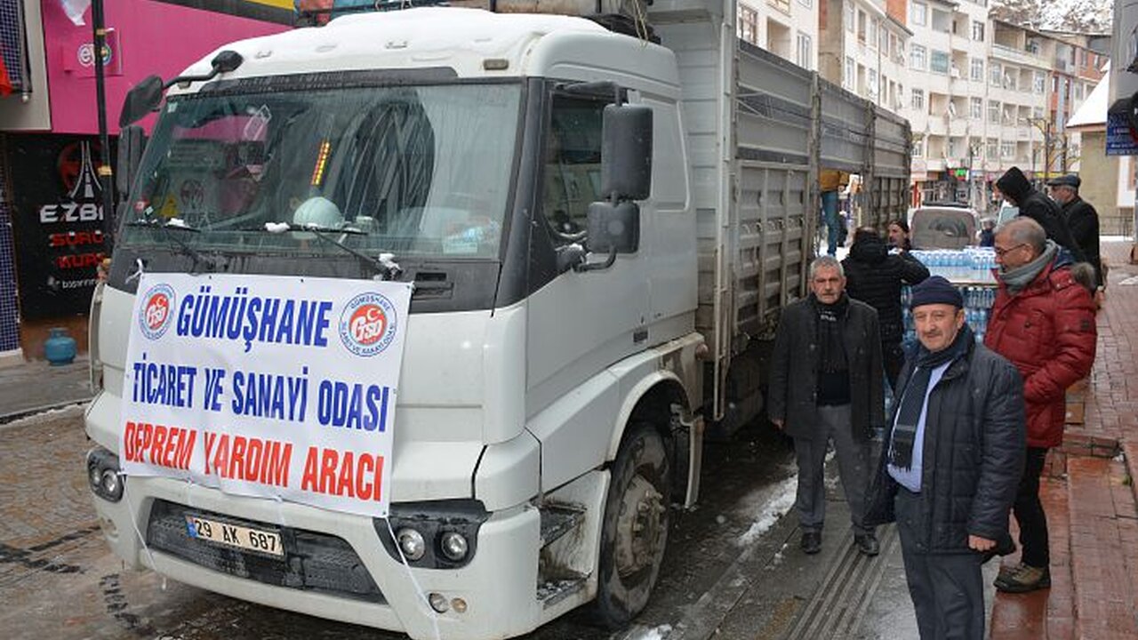 Depremden etkilenen 10 ildeki afetzedelerin yaralarını sarmak için Türkiye Odalar ve Borsalar Birliği'nin (TOBB) koordinasyonunda başlatılan yardım kampanyasına canla başla çalışarak önemli bir katkı veren Gümüşhane Ticaret ve Sanayi Odası (GTSO) ilk günden itibaren topladığı yardımları 3 tır, 1 kamyonet ve 1 minibüsten oluşan 5 araçlık yardım konvoyu ile afetzedelere ulaştırmaya devam ediyor.