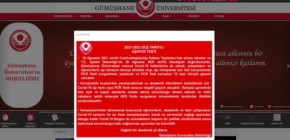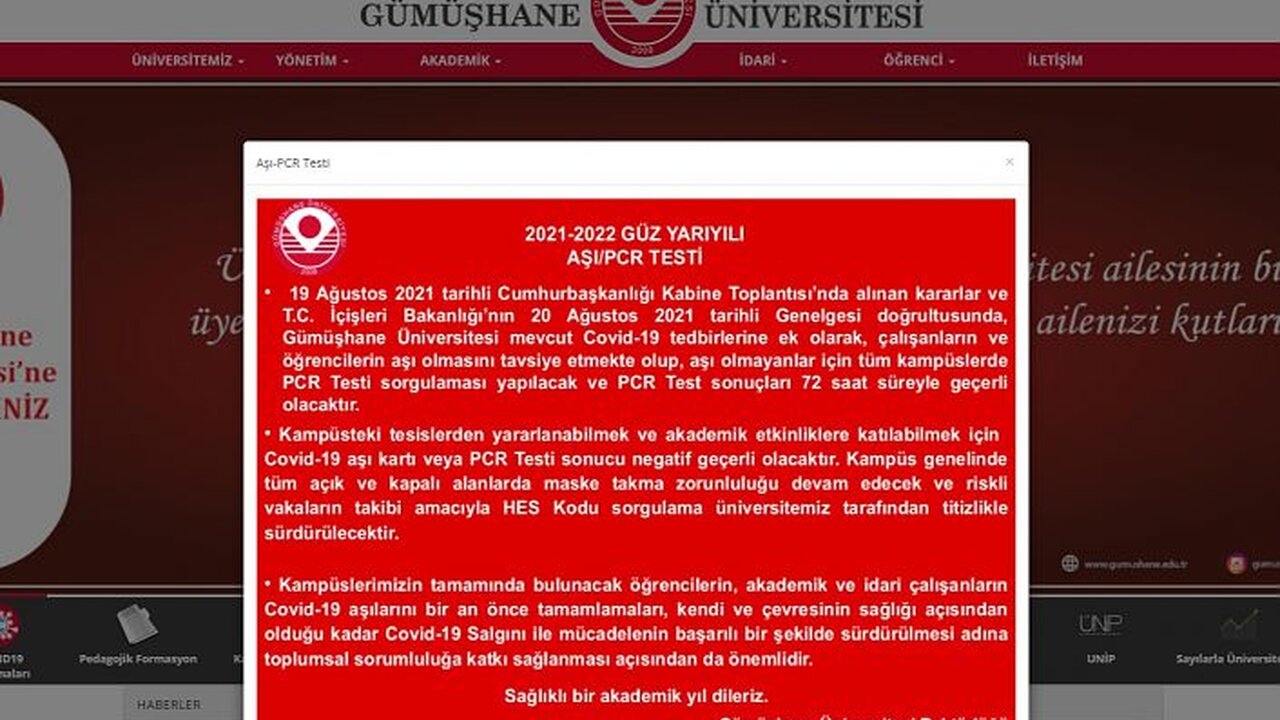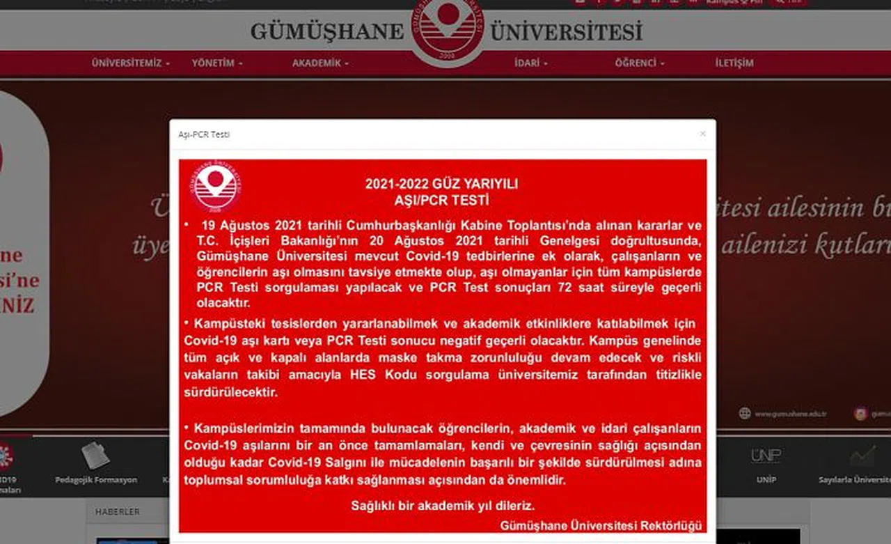 Kurumun web sitesinde konuyla ilgili yapılan duyuruda 19 Ağustos 2021 tarihli Cumhurbaşkanlığı Kabine Toplatısı’nda alınan kararlar de T.C. İçişleri Bakanlığı’nın 20 Ağustos 2021 tarihli genelgesi doğrultusunda Gümüşhane Üniversitesi’nin mevcut Covid-19 tedbirlerine ek olarak çalışanların ve öğrencilerin aşı olmasını tavsiye ettiği, aşı olmayanlar için tüm kampüslerde PCR Testi sorgulaması yapılacağı ve PCR Test sonuçlarının 72 saat süreyle geçerli olacağı ifade edildi.