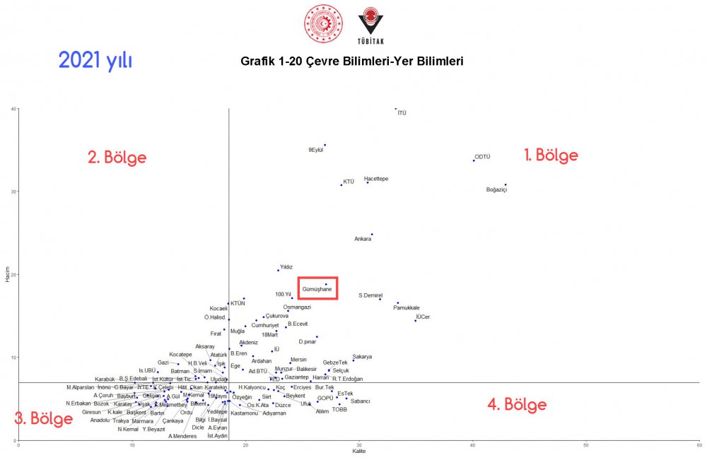Tüm üniversitelerin karşılaştırıldığı 2020 ve 2021 yılları ‘Alan Bazlı Yetkinlik Analizi’ grafiklerinde, Gümüşhane Üniversitesi, Yer Bilimleri (Jeoloji + Jeofizik) alanında 1’inci bölgede yer alma başarısını gösterdi. Hacim ve kalite bakımından diğer üniversiteler ile karşılaştırıldığında 2020 yılında ilk 10 üniversite, 2021 yılında ise ilk 15 üniversite arasına girme başarısını gösterdi.