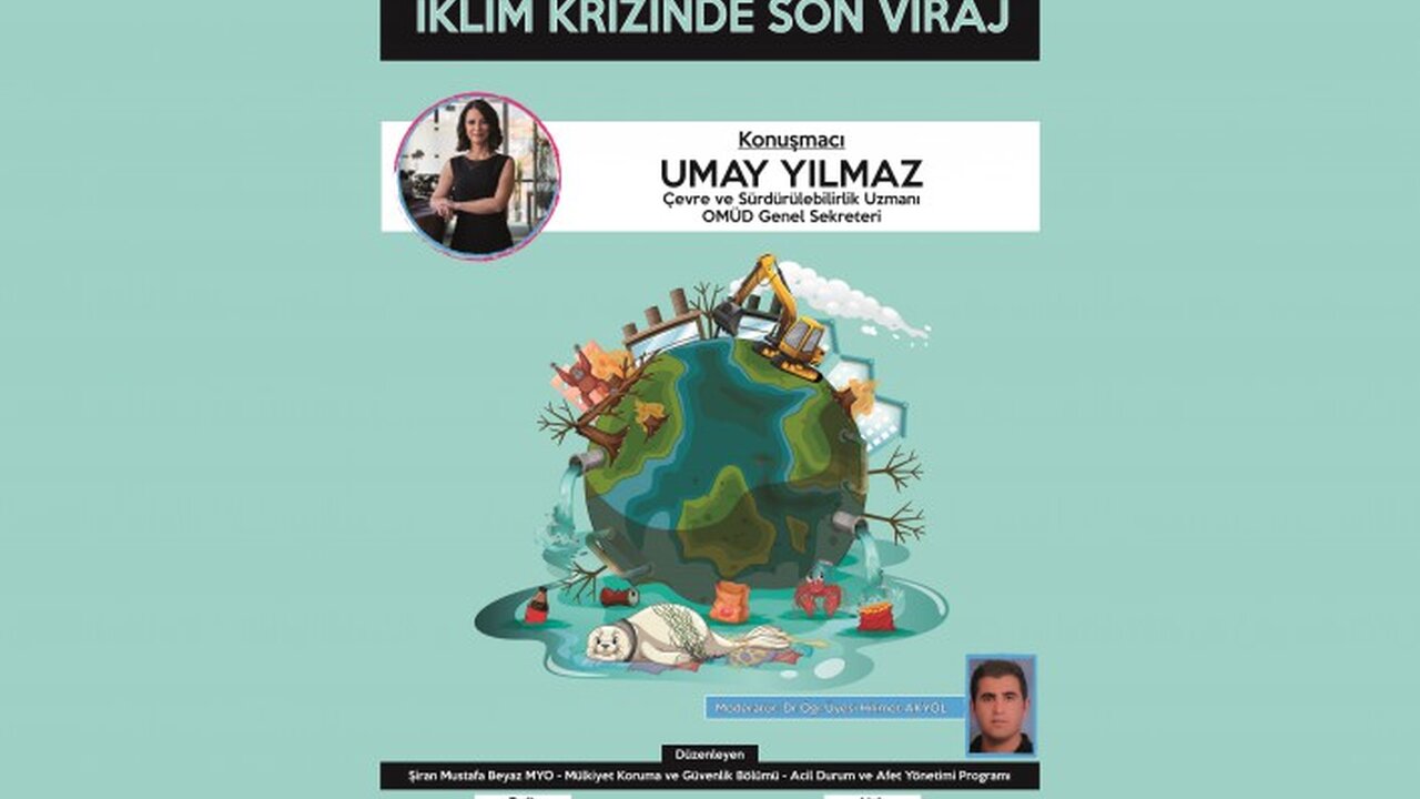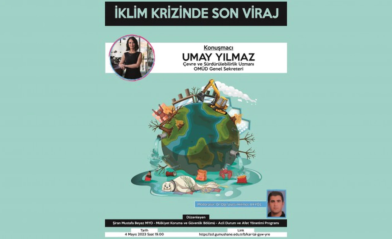 İklim değişikliğinin sadece bir çevre sorunu olmadığını ve insanlığın tarih boyunca tecrübe ettiği en büyük krizlerden birisi olduğunu dile getiren Rektör Prof. Dr. Halil İbrahim Zeybek, “İklim krizi sorununun en önemli nedenlerinden bir tanesi hayat tarzımızın, felsefemizin tamamen değişmesidir. Özellikle Sanayi Devrimi’nden sonra başta fosil yakıt kullanımı, ormanların aşırı tahrip edilmesiyle birlikte atmosferimizde bulunması gerektiğinden daha fazla sera gazı birikmeye başladı. Bu küresel ölçekte iklimde, başta sıcaklık artışı oluşturacak bir değişikliğe sebep oldu. Gelecekte sıcaklıkların artmasıyla birlikte kuraklığın artacağı, su kaynaklarımızın azalacağı, yeni göç dalgalarının çıkacağı, tarım ürünlerinde gıda güvenliğinin ve birçok ürünün üretim alanlarının değişeceği bir dünya bizi bekliyor demektir. Küresel iklim değişikliğinin etkilerinin azaltılması için alınacak önlemlerden bir tanesi de bireysel önlemler arasında karbon ayak izini küçültmek en öndedir. Bu ve benzeri önlemleri alabilmek için de bilinçli toplumun yetiştirilmesine öncülük etmek gerekiyor. Bu vesileyle de Üniversitemiz Şiran Mustafa Beyaz MYO Mülkiyet Koruma ve Güvenlik bölümü Acil Durum ve Afet Yönetimi programı tarafından düzenlenen ‘İklim Krizinde Son Viraj’ adlı söyleşi programına katılarak öğrencilerimizi bilgilendiren Çevre ve Sürdürülebilirlik Uzmanı Sayın Umay Yılmaz’a katkılarından, etkinliğin gerçekleşmesinde aldığı rolden dolayı da Dr. Öğr. Üyesi Hikmet Akyol hocamıza teşekkür ediyorum” dedi.