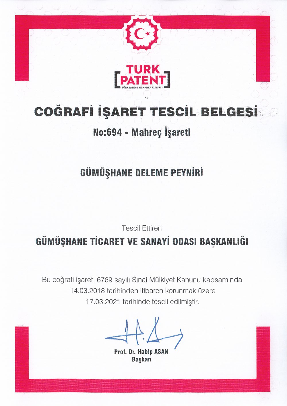 GTSO tarafından Türk Patent ve Marka Kurumu'na yapılan coğrafi işaret başvurularından bir tanesi olan ‘Gümüşhane Deleme Peyniri’de yapılan ilgili inceleme ve tetkiklerden sonra Gümüşhane’ye özgü Coğrafi İşaretli Ürün olarak tescillendi. Böylece Gümüşhane’ye ait bir önemli damak tadı da tescillenirken kadim şehre ait Coğrafi İşaretli ürün sayısı da 10’a yükseldi.