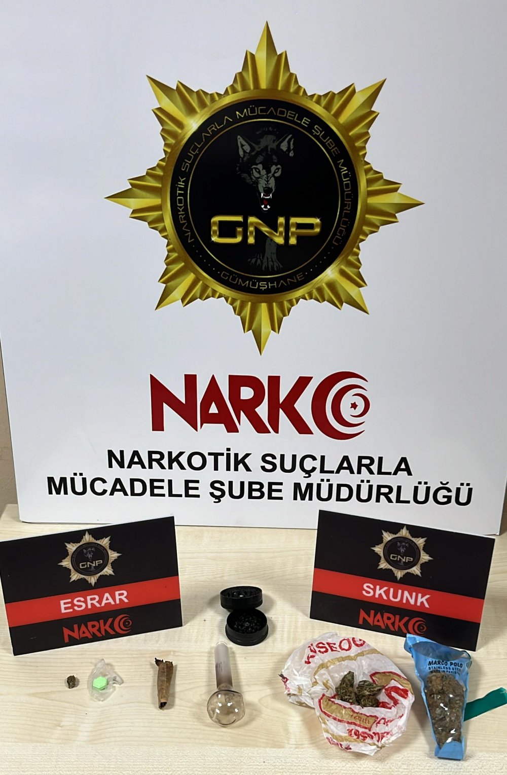 Araçta yapılan aramada 11,8 gram Skunk maddesi, 0,7 gram tütünle karışık esrar maddesi, 1 adet Ecstasy hap, 1 adet uyuşturucu madde kullanımına yarayan ve payp adı verilen aparat ile 1 adet esrar öğütücü ele geçirildi.