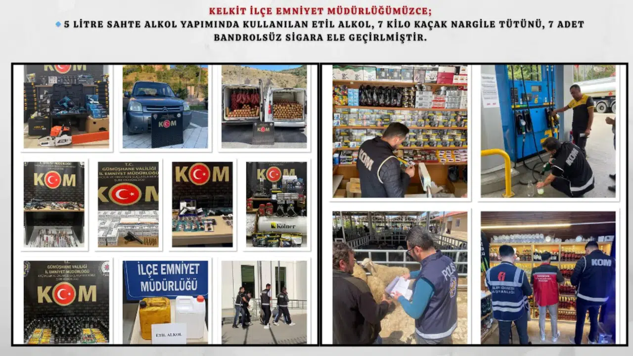 Operasyonların ilçe ayaklarında da hareketlilik sürdü. Kelkit İlçe Emniyet Müdürlüğü tarafından yapılan çalışmalarda, sahte alkol yapımında kullanılan 5 litre etil alkol, 7 kilo kaçak nargile tütünü ve bandrolsüz sigaralar ele geçirildi.