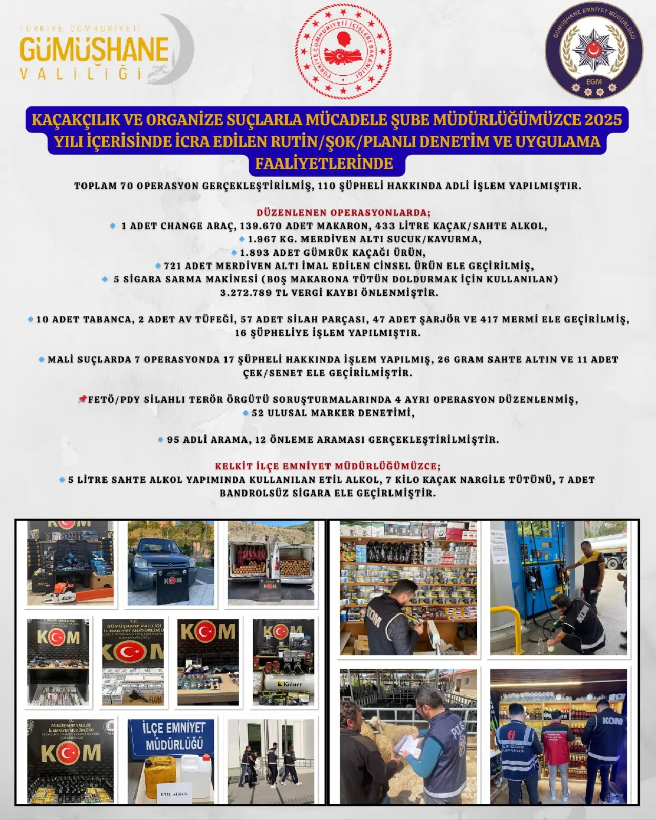 Gümüşhane İl Emniyet Müdürlüğü, Kaçakçılık ve Organize Suçlarla Mücadele (KOM) Şube Müdürlüğü, 2025 yılı içerisinde gerçekleştirdiği geniş kapsamlı operasyonlarla suç şebekelerine ve kayıt dışı ekonomiye geçit vermedi.