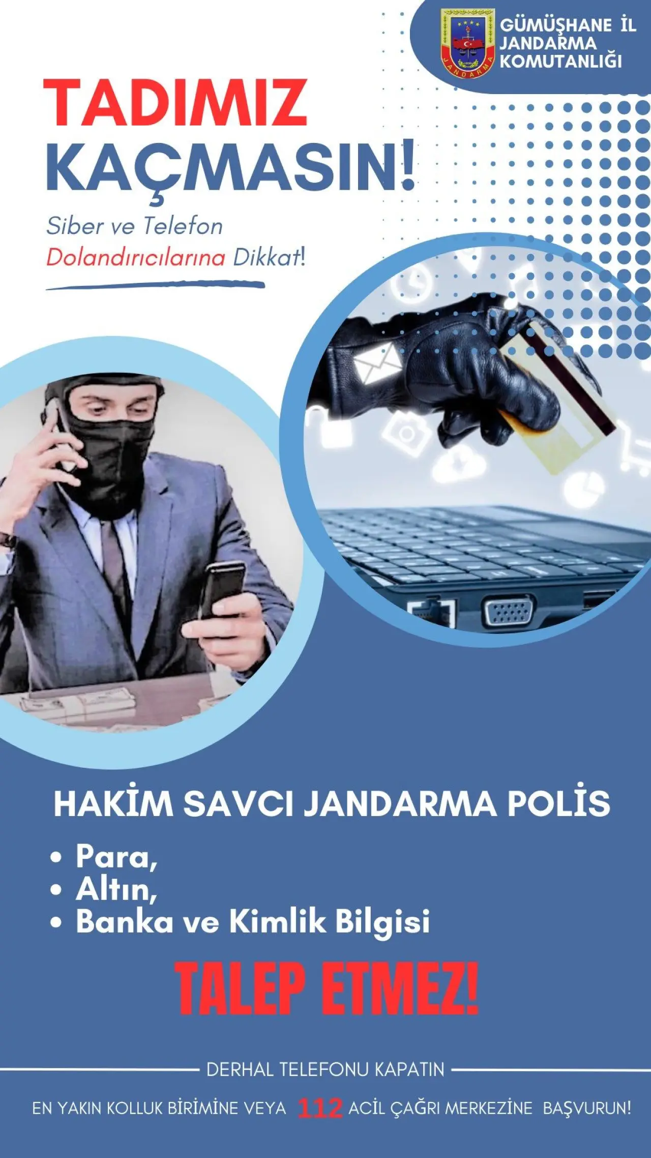 Jandarma birimleri, hiçbir kamu görevlisinin vatandaştan telefon üzerinden maddi bir talebi olmayacağının altını çizerek, bu tür aramalarda telefonun derhal kapatılması ve 112 Acil Çağrı Merkezi'ne bilgi verilmesi gerektiğini duyurdu.