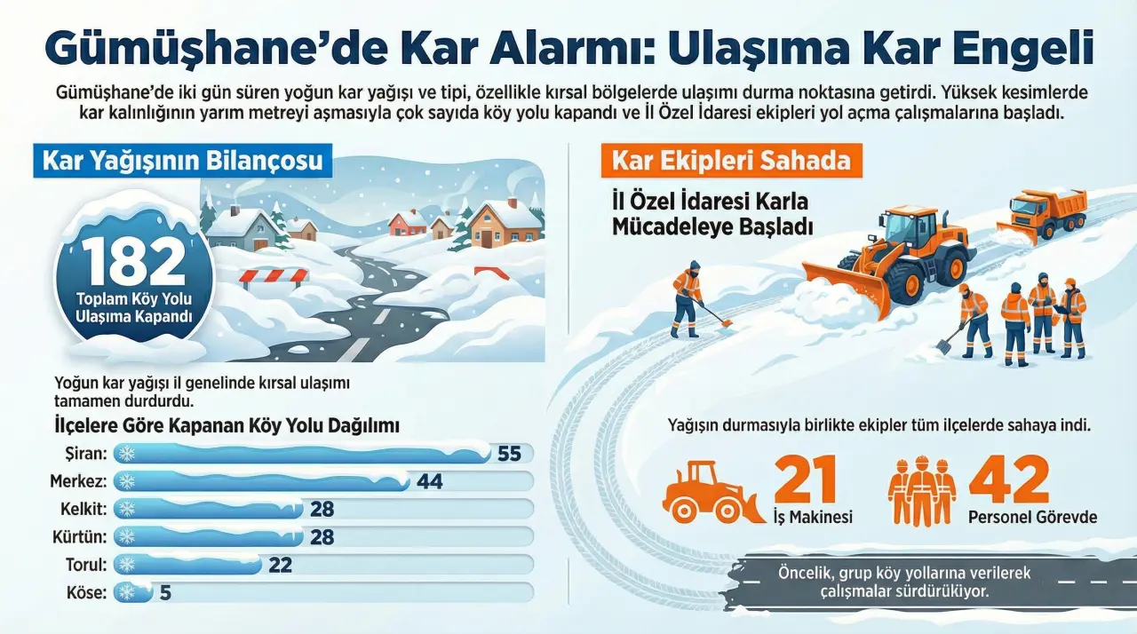 Kar yağışının şiddetini en fazla gösterdiği ilçe olan Şiran’da 55 köy yolu ulaşıma kapanırken, Merkez ilçede 44 köyle ulaşım sağlanamıyor. Kelkit’te 28, Kürtün’de 28, Torul’da 22 ve Köse’de 5 köy yolu kar yağışı nedeniyle kapandı.