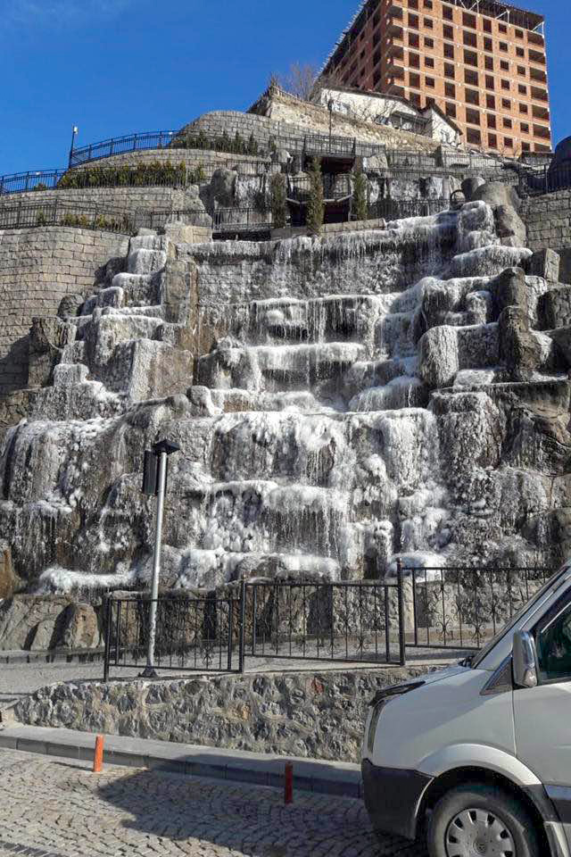 Gümüşhane’de hafta sonu gerçekleşen kar yağışının ardından hava sıcaklıklarının aşırı düşmesi sonucu kent merkezindeki yapay şelale ve su birikintileri buz tuttu.