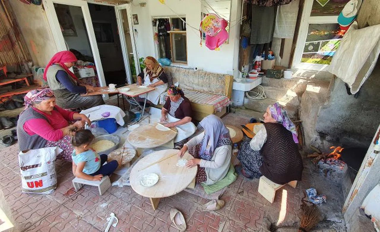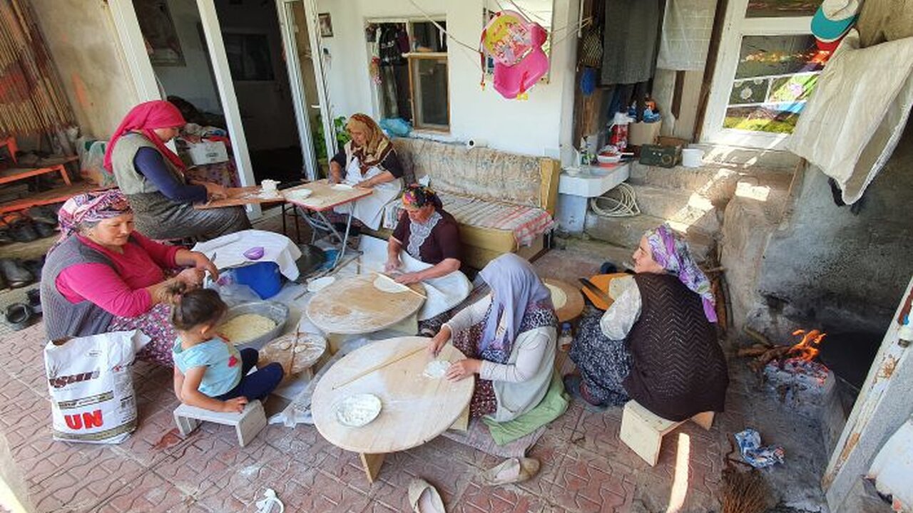 Merkeze bağlı Dörtkonak köyü ve birçok köyde uygun olan alanlarda yeni tip koronavirüs hastalığı salgını nedeniyle sosyal mesafeye dikkat ederek bir araya gelen mahalle sakinleri atalarından kalan geleneklerini sürdürerek yalnız yapılması çok zor olan hamur işlerini saatlerce çalışarak imece usulü ile gerçekleştiriyor.