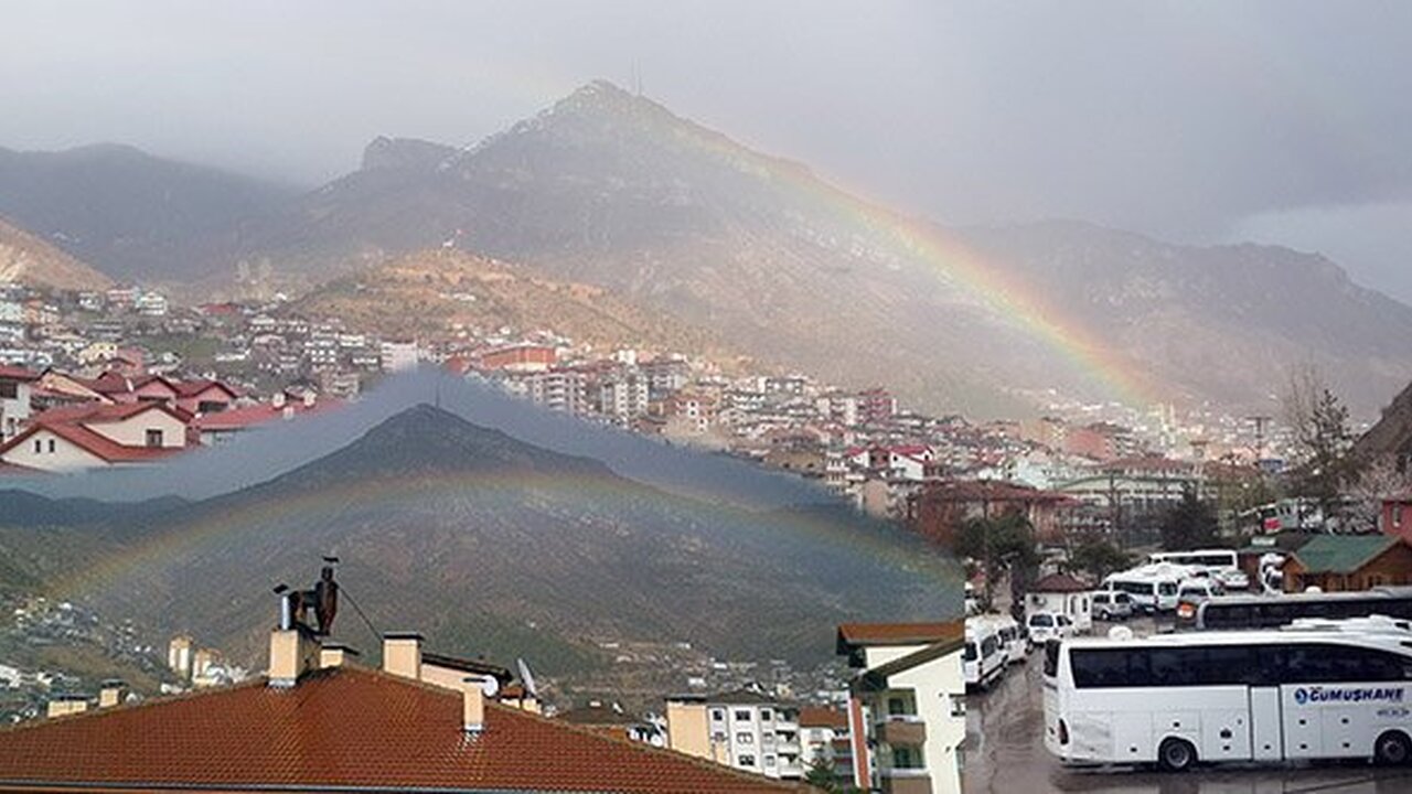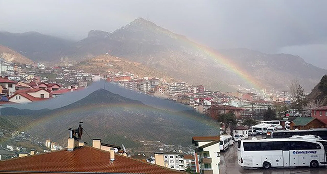 Gümüşhane’de bugün öğleden sonra gerçekleşen yağışın ardından güneşin yüzünü kısa süreli göstermesiyle gökkuşağı resitali yaşandı.