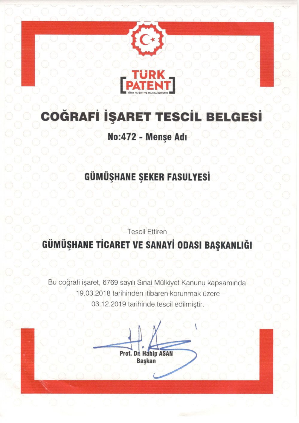 Gümüşhane Şeker Fasulyesi, Gümüşhane Ticaret ve Sanayi Odası (GTSO) tarafından yapılan çalışmalar neticesinde Türk Patent ve Marka Kurumu (TPE) tarafından Coğrafi İşaretli ürün olarak tescillendi.