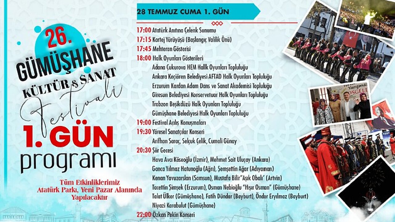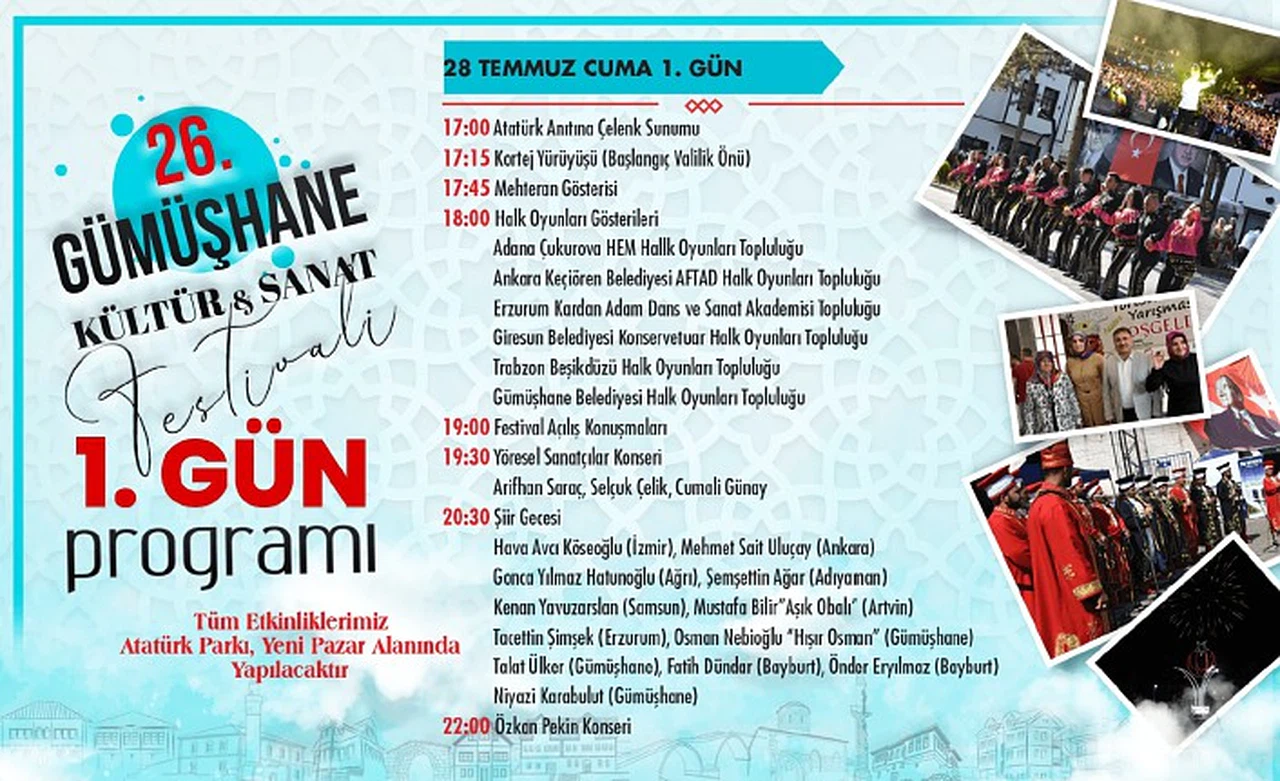 Festivalin 1.günü olan 28 Temmuz Cuma günü saat 20.30'da Atatürk Parkında gerçekleştirilecek etkinliğe hem Gümüşhane'nin hem de Türkiye'nin usta kalemlerinden oluşan 12 şair katılacak.
