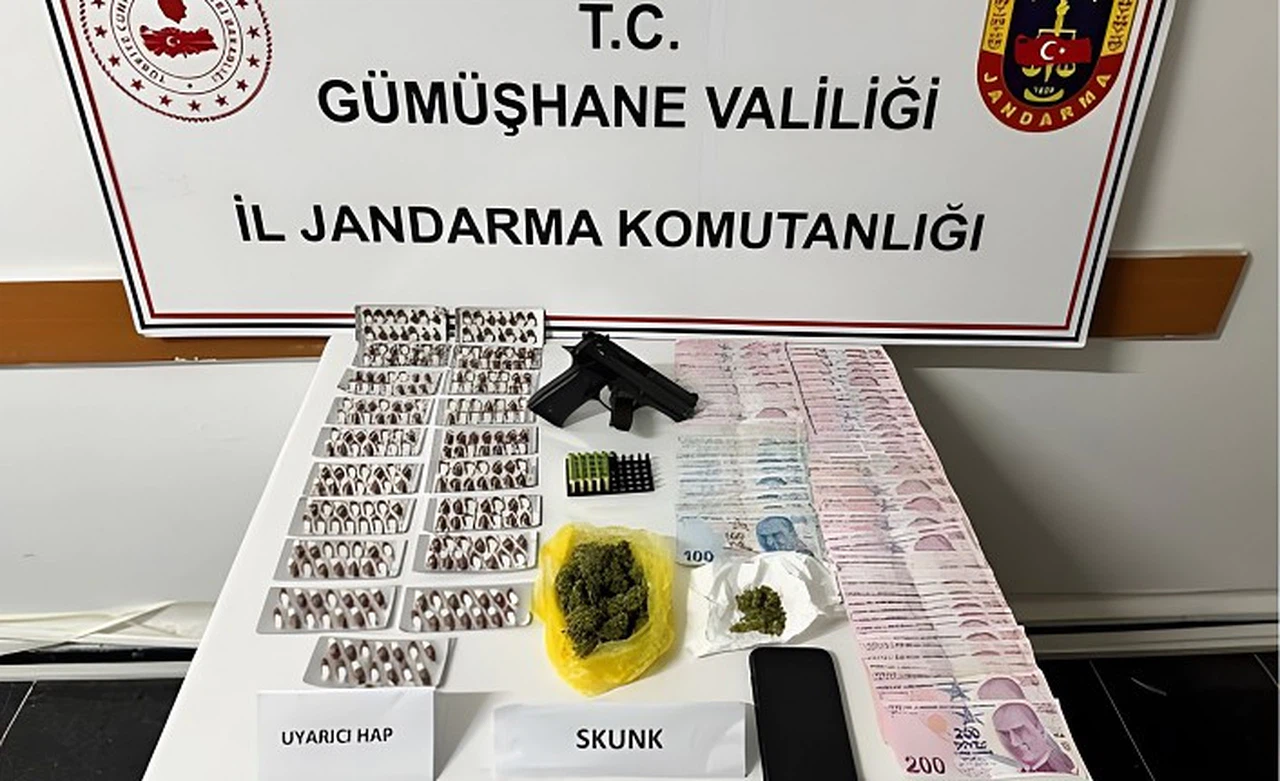 Gümüşhane’de İl Jandarma Komutanlığı ekipleri kent merkezinde yaptıkları operasyonda çok sayıda uyuşturucu madde, tabanca ve nakit para ele geçirdi.