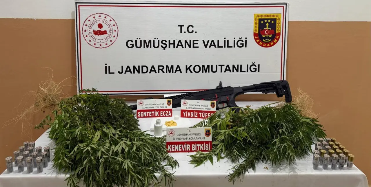 Aynı gün KOM ekipleri, Şiran İlçe Jandarma Komutanlığı ile birlikte gerçekleştirdikleri çalışmada, Yeşilbük Beldesi’nde C.B. isimli şahsın evinin bahçesinde kenevir ektiğini tespit etti. Bahçede yapılan adli aramada 45 kök kenevir bitkisi, evde ise 40 adet sentetik ecza maddesi, 1 ruhsatsız tüfek ve 35 adet tüfek fişeği bulundu.