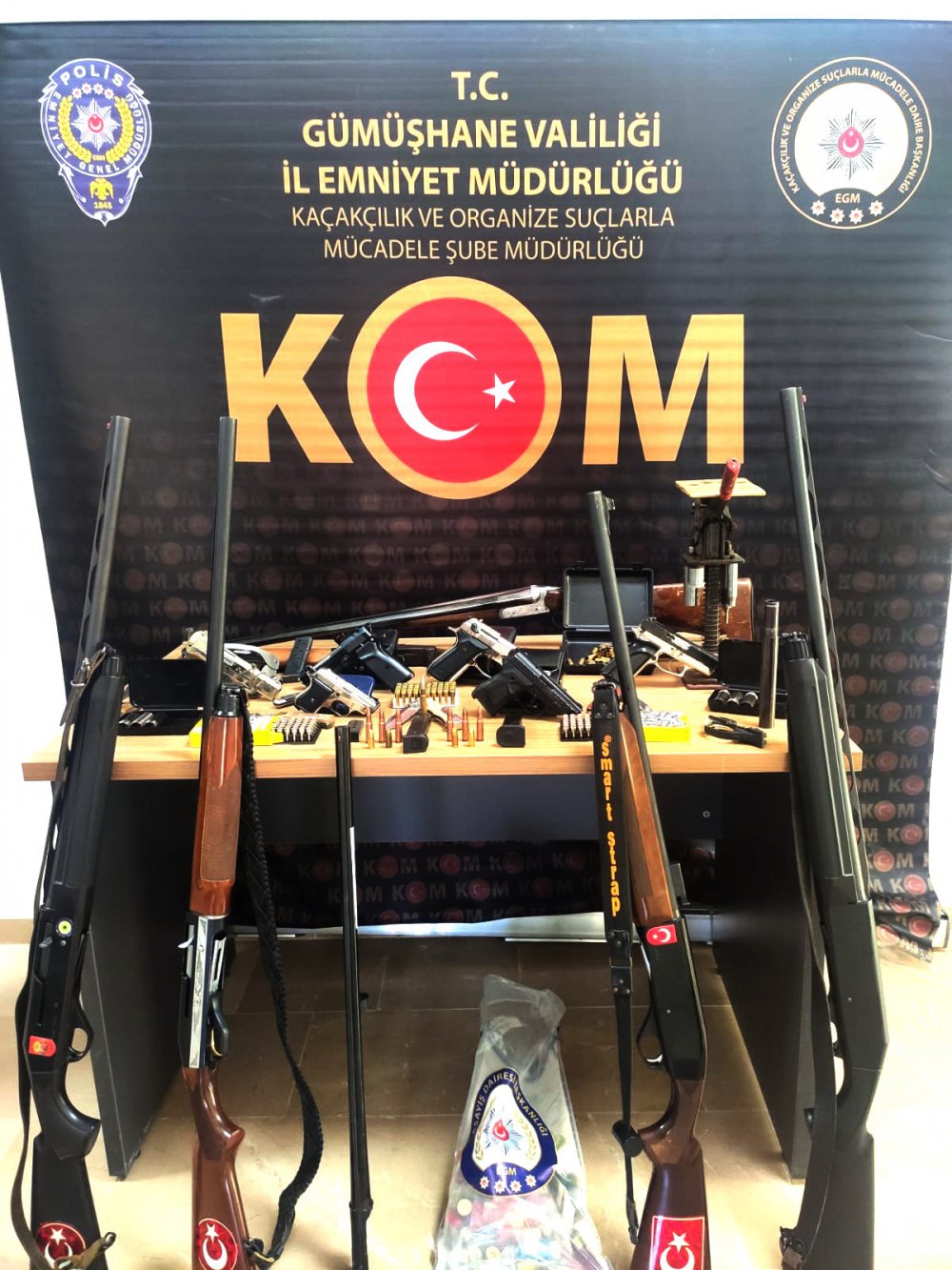 Gümüşhane’de İl Emniyet Müdürlüğü ekipleri Torul ilçesinde kaçak silah imalatı yapan şahsa yönelik düzenlediği operasyonda çok sayıda silah, mermi ve silah yapımında kullanılan malzeme ele geçirdi.