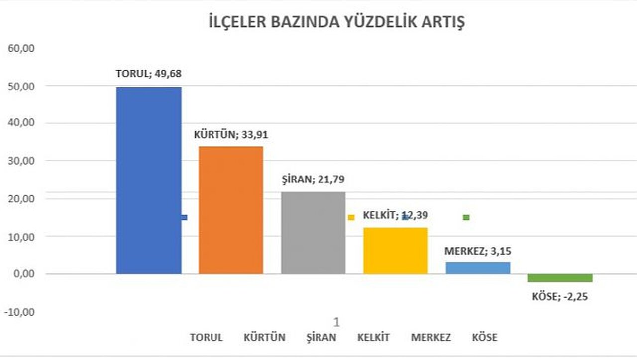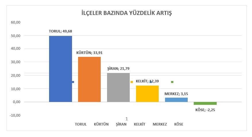 Kurumdan yapılan açıklamada ilçeler bazında yüzdelik artış tablosunda Torul’un yüzde 49,68, Kürtün’ün yüzde 33,90, Şiran’ın ise yüzde 21,79 artış ile üstün başarı sağladığı bildirildi.