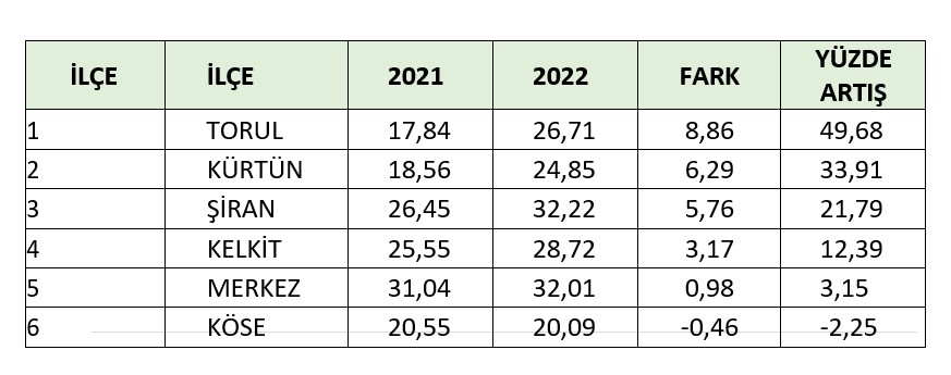 Kurumun gönderdiği bilgi notunda yer alan tabloya bakıldığında ise bir önceki yıla göre yüzdelik artış tablosunda il merkezinin yüzde 3,15 ve Kelkit ilçesinin yüzde 12,39 oranında artması ile yalnızca Köse ilçesinin yüzde 2,25 oranında düşmesi dikkat çekti.