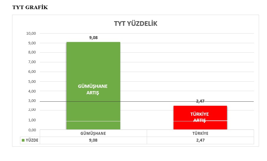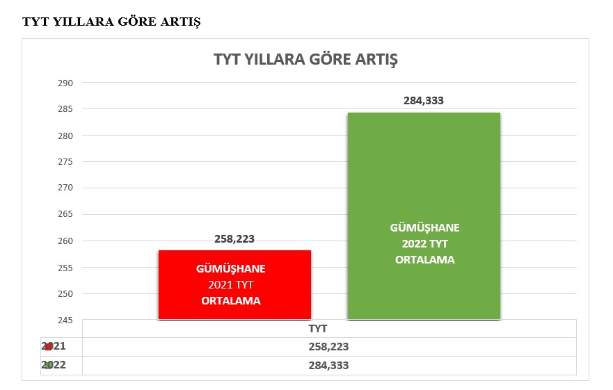 2021 yılında il genelinde 258 olan TYT ortalamasının bu yıl 284’e yükselmesi sevindirici bulunurken, ülke genelinde TYT’deki artış yüzde 2,47 iken Gümüşhane’de bu artış yüzde 9,08 oranında gerçekleşti.