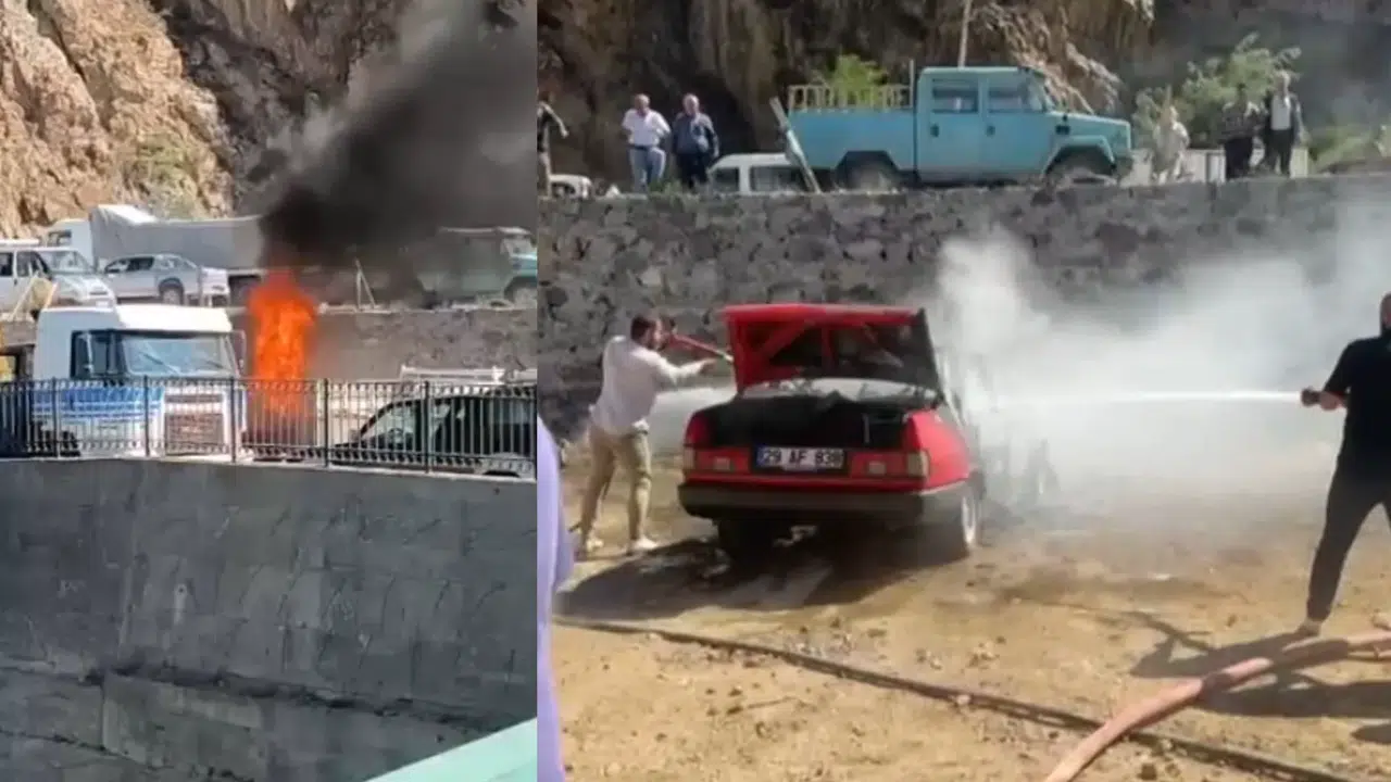 Kısa sürede büyüyerek alevlere teslim olan araca vatandaşlar müdahale etmeye çalıştı.