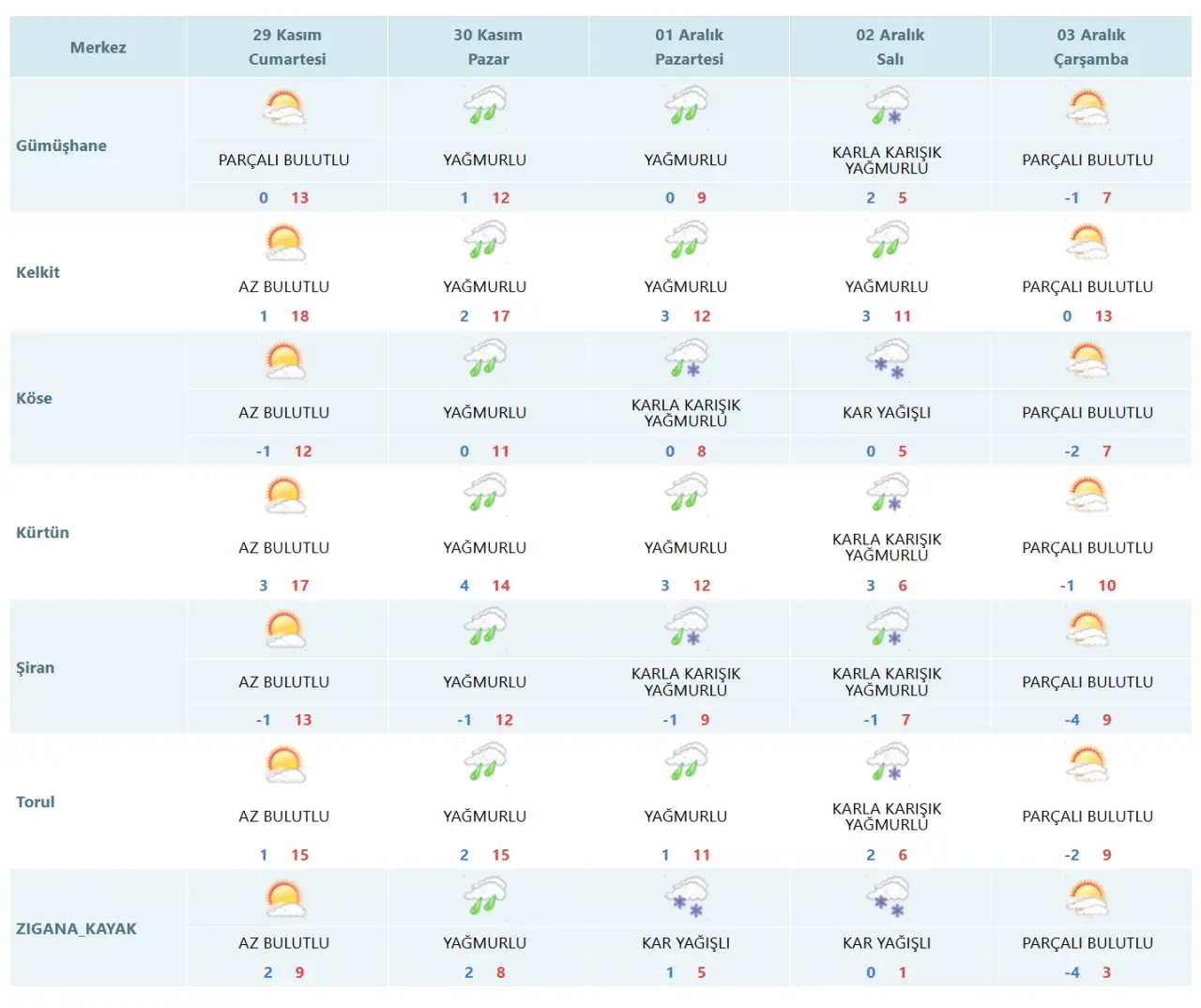 Özellikle gece saatlerinde termometrelerin sıfırın altına düşeceği tahmin ediliyor. Yüksek kesimlerde (Zigana, Tersun Dağı gibi) kar yağışının etkili olacağı, şehir merkezinde ise yağmurun yerini zaman zaman karla karışık yağmura ve kara bırakacağı öngörülüyor.