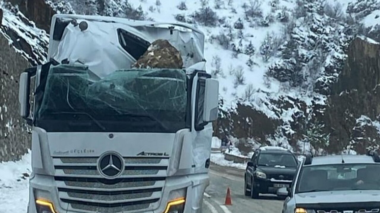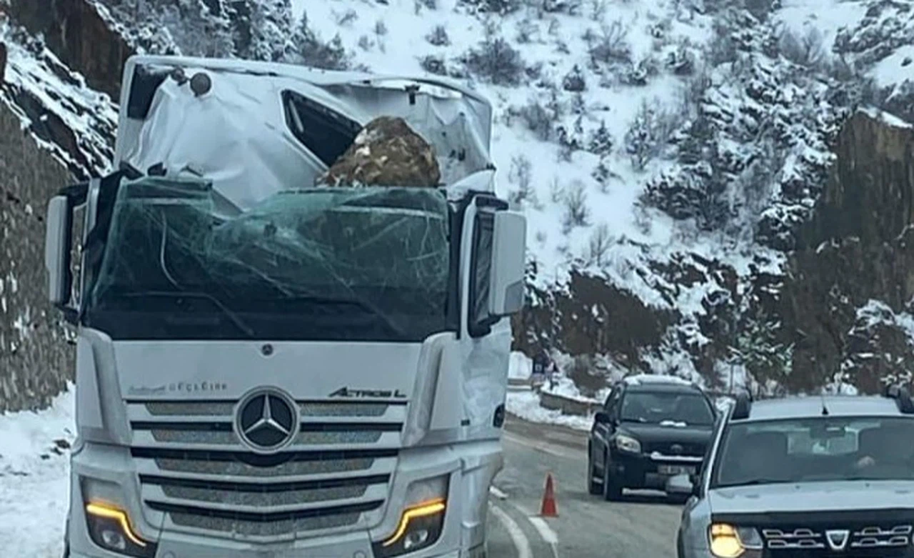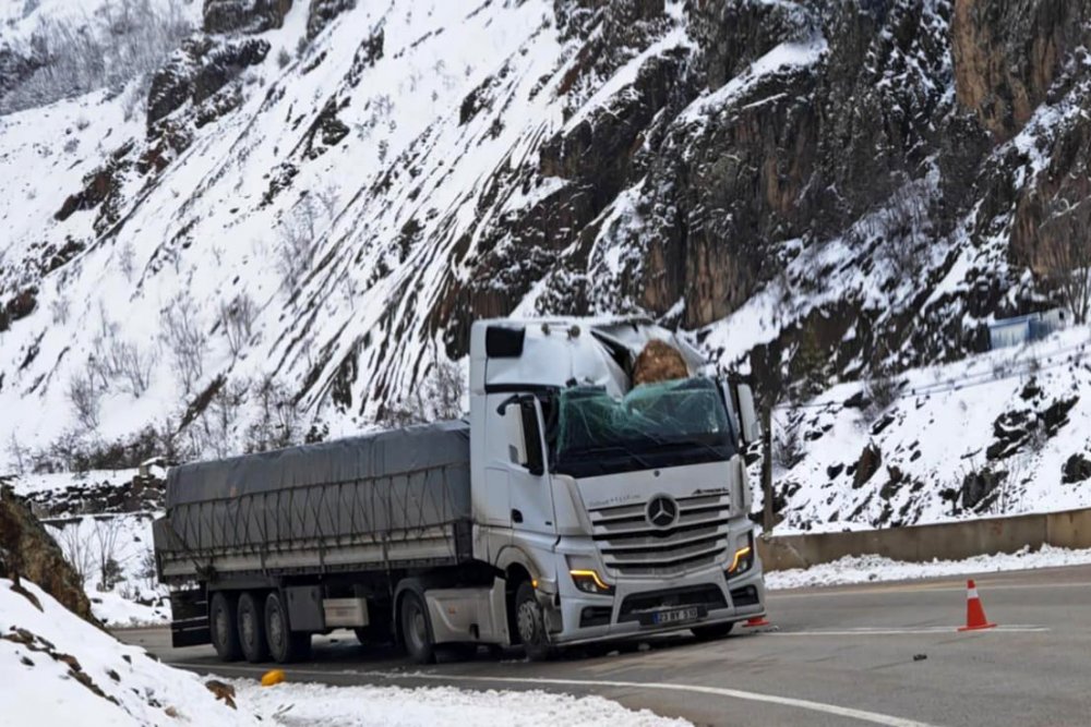 Edinilen bilgilere göre, Gümüşhane’den Giresun istikametine seyreden Yunus Ortak (37) yönetimindeki 23 BY 510 plakalı tır, Torul-Kürtün-Tirebolu karayolunun Kirazlık köyü mevkiine geldiği sırada dağdan kopan kaya kütlesinin hedefi oldu. Tırın kupası olarak bilinen ön bölümüne düşen dev kaya, sürücü tarafını etkiledi ve sürücünün yaralanmasına neden oldu.