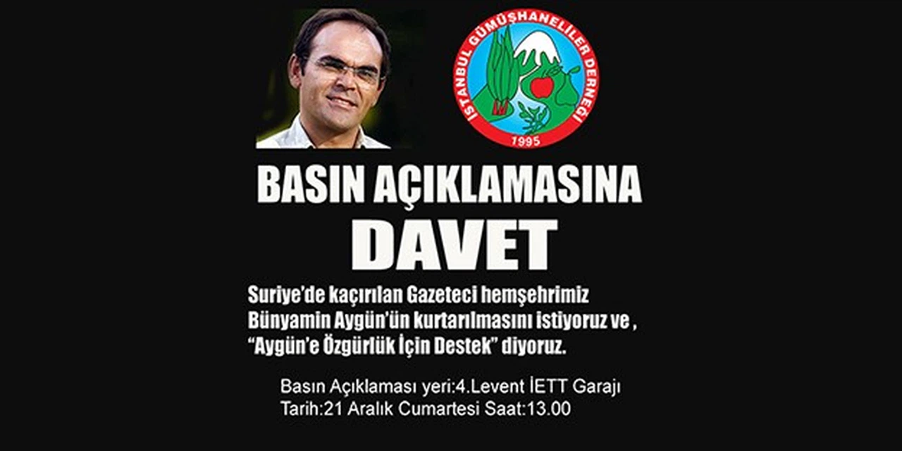 İstanbul Kağıthane ilçesi 4. Levent İETT Garajında yapılacak basın açıklamasıyla ilgili dernekten yapılan açıklamada şu ifadelere yer verildi: “Gazeteci hemşehrimiz Bünyamin Aygün Suriye’de El Kaide yanlısı örgüt üyelerince kaçırılmış olup, yaklaşık 3 haftadır kendisinden haber alınamamaktadır. Devlet büyüklerine çağrıda bulunmak ve hemşehrimiz Bünyamin Aygün’ün kurtarılarak özgürlüğüne kavuşmasını sağlamak amaçlı basın açıklamamıza herkesi davet ediyoruz.”