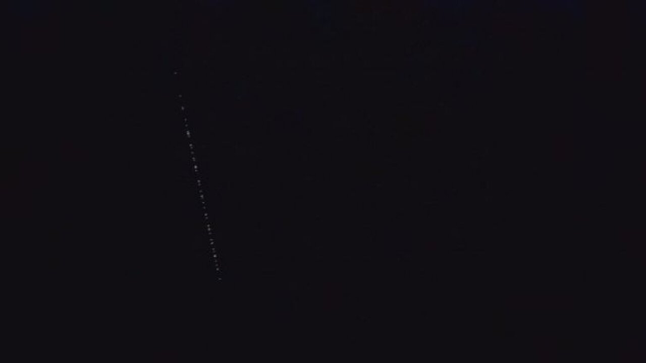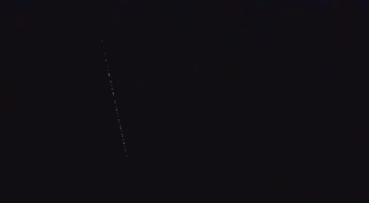 Görüntüde bir vatandaşın gökyüzünde ardı ardına dizilmiş Starlink Uydu Ağı Projesine ait uyduları gördüğündeki şaşkınlığı kameralara yansıdı.