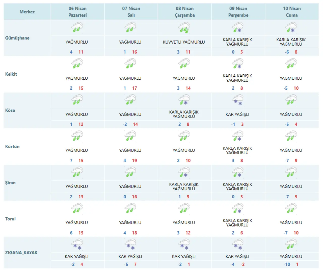 Yapılan son meteorolojik değerlendirmelere göre, Gümüşhane’de soğuk hava dalgası etkisini sürdürecek. 8 Nisan 2026 Çarşamba ve 9 Nisan 2026 Perşembe günleri bölgede yeni bir yağışlı sistemin etkili olması bekleniyor.