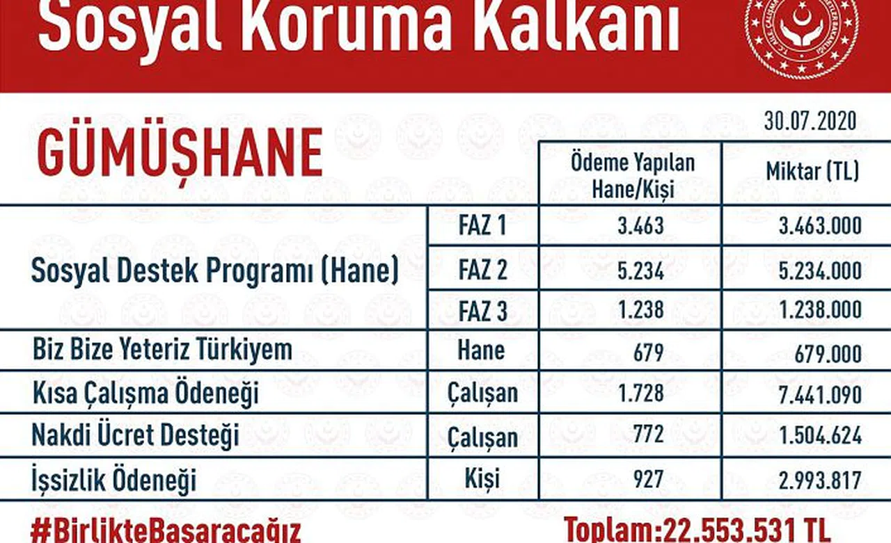 Konuyla ilgili sosyal medya hesabından yaptığı açıklamada "İnsanı yaşat ki devlet yaşasın. Covid 19 salgınıyla mücadele kapsamında Aile Çalışma ve Sosyal Hizmetler Bakanlığı marifetiyle ilimiz genelinde hemşehrilerimize bugüne kadar 22 milyon 553 bin lira nakdi destekte bulunulmuştur. Ülkemiz genelindeki rakam ise 29 milyar 744 milyon TL’dir. Saygıdeğer Cumhurbaşkanımıza ve emeği geçenlere şükranlarımızı sunuyoruz" ifadelerini kullanan Köse, yapılan yardımlarla ilgili tabloyu paylaştı.