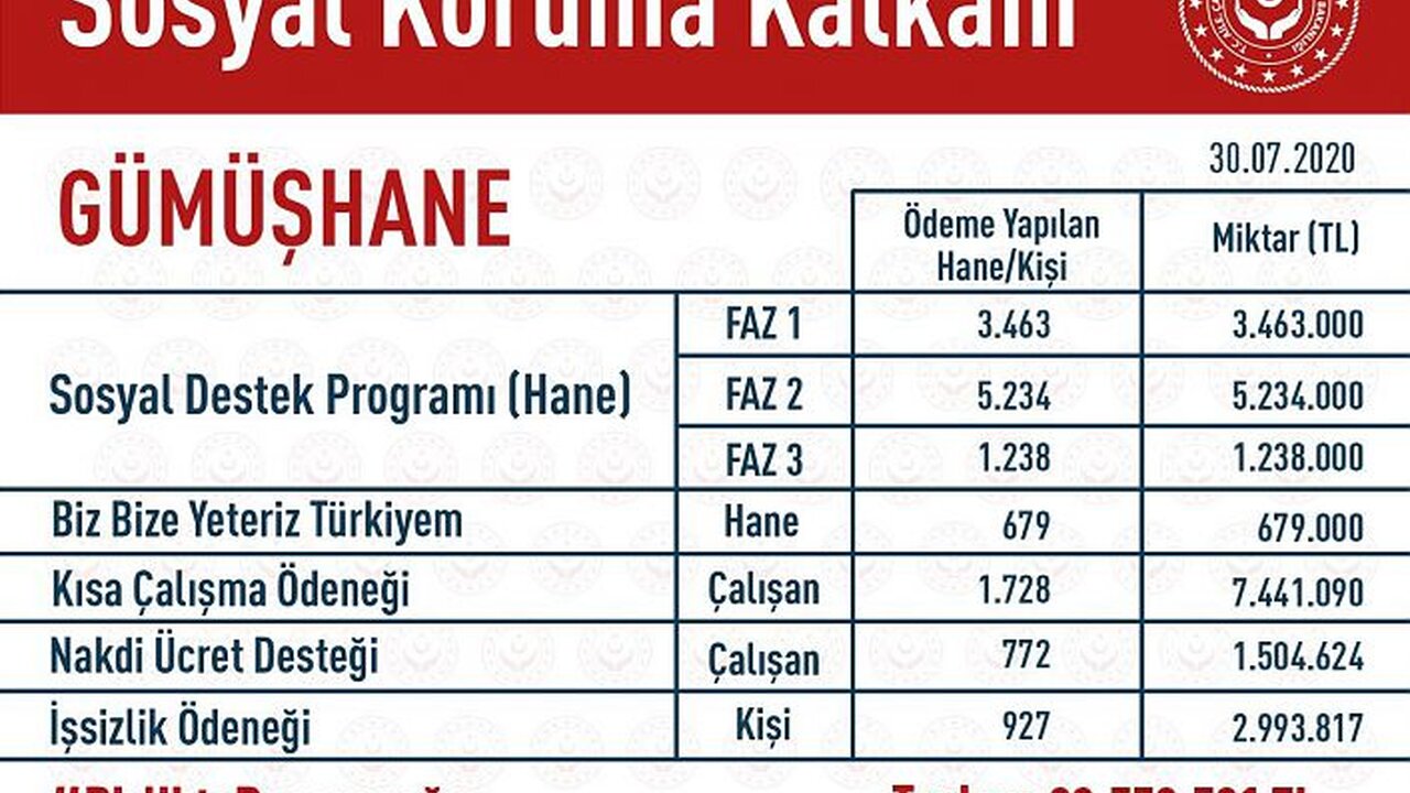 Sosyal Destek Programı (Hane) kapsamında Faz 1 kapsamında 3 bin 463 haneye 3 milyon 463 bin TL, Faz 2 kapsamında 5 bin 234 haneye 5 milyon 234 bin TL, Faz 3 kapsamında bin 238 haneye bir milyon 238 bin TL, Biz Bize Yeteriz Türkiyem faslından 679 haneye 679 bin TL, Kısa Çalışma Ödeneği kapsamında bin 728 çalışana 7 milyon 441 bin 90 TL, Nakdi Ücret Desteği kapsamında 772 çalışana 1 milyon 504 bin 624 TL ve İşsizlik Ödeneği kapsamında da 927 kişiye 2 milyon 993 bin 817 TL ödendiğini söyledi.
